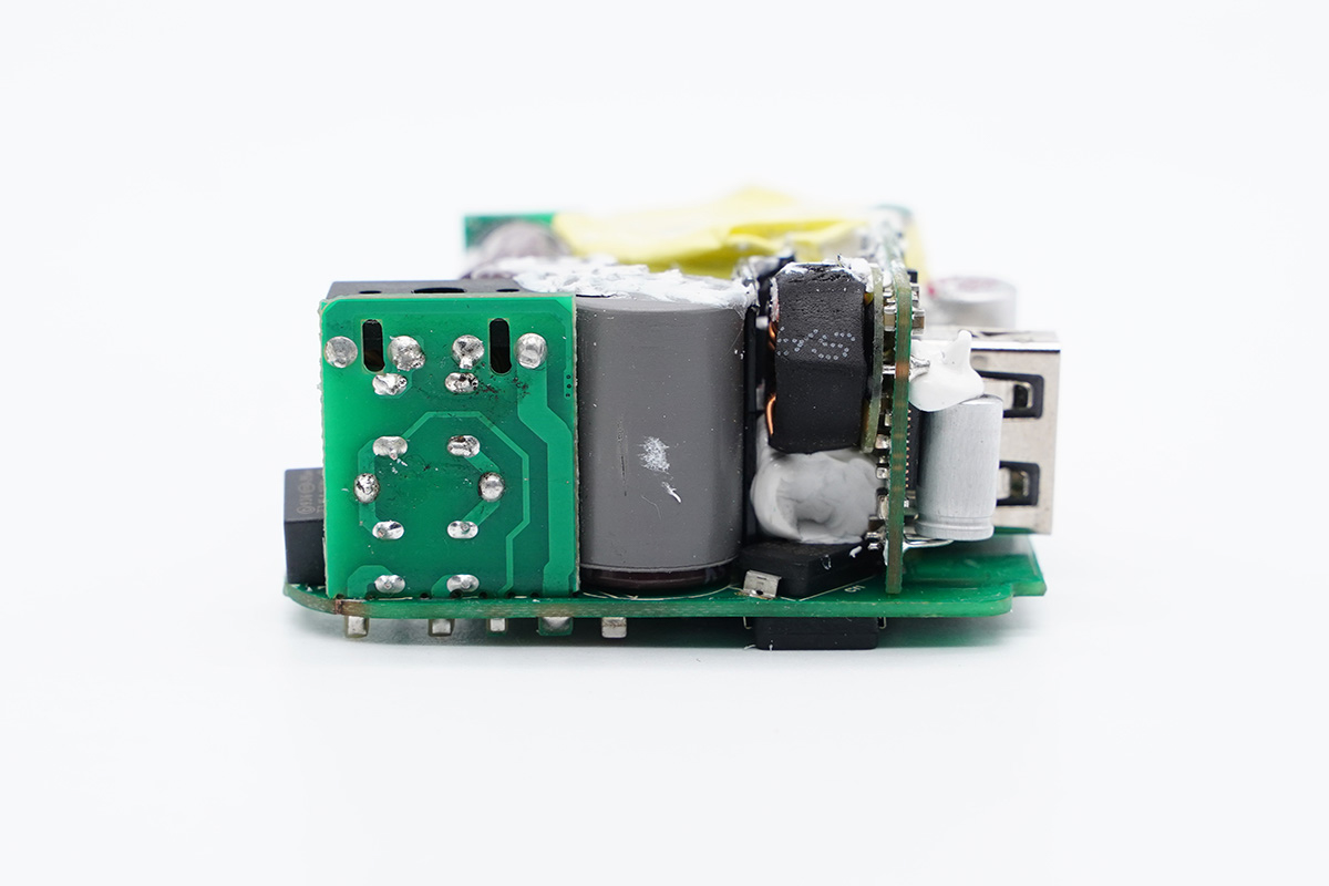 充電器輸出端設(shè)有小板,USB母座垂直焊接在小板上,兩顆濾波固態(tài)電容打膠加固。