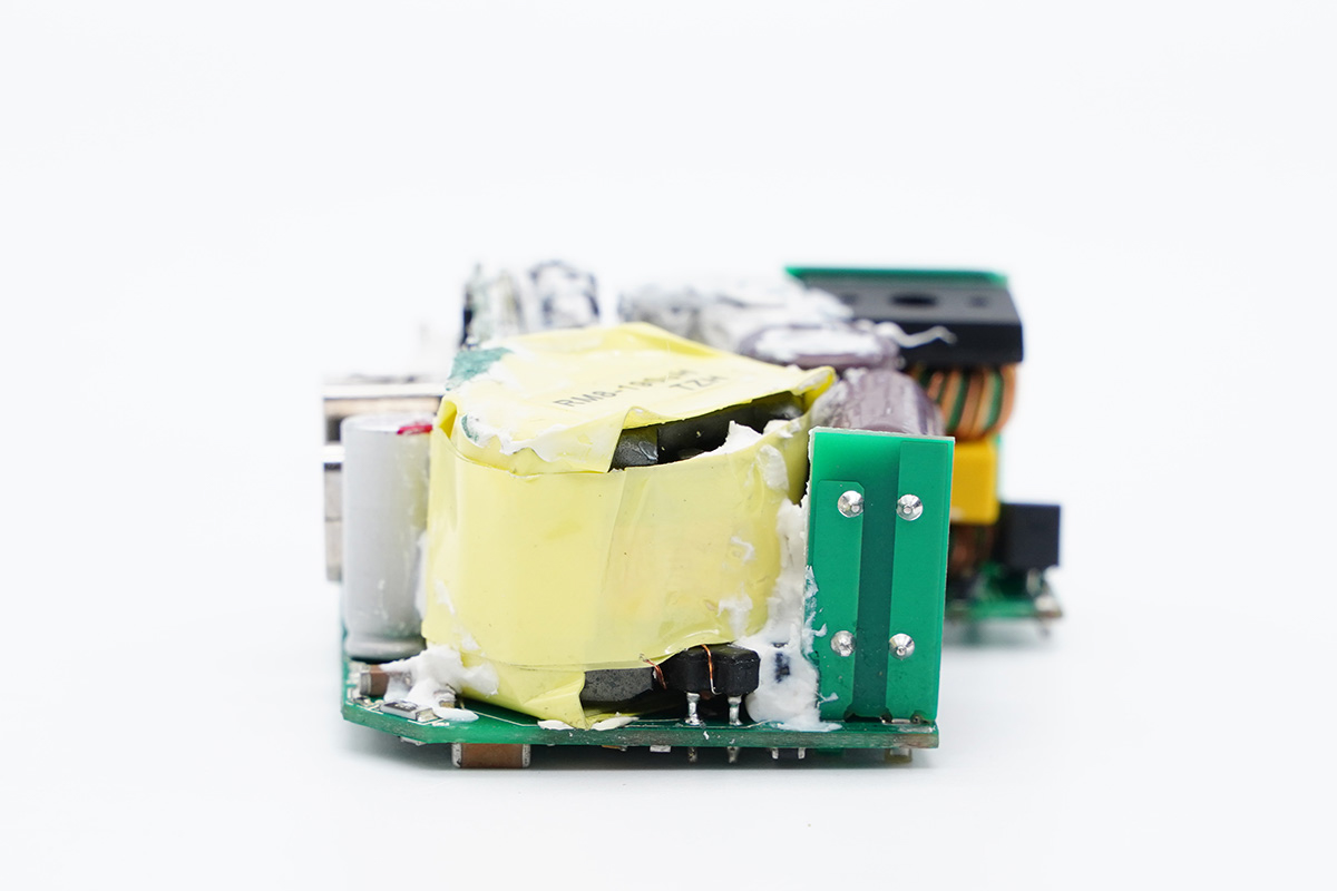 散熱片下打膠幫助加固和導(dǎo)熱,清理干凈可以看見(jiàn)中心設(shè)有濾波電感和固態(tài)電容,初次級(jí)之間設(shè)有隔離板。