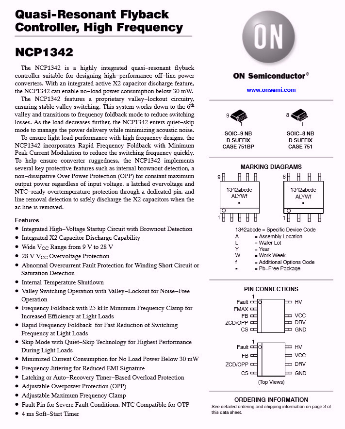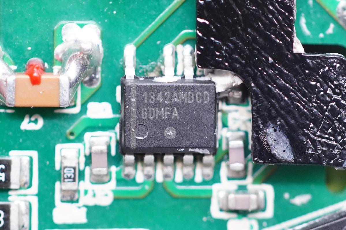 充電器主控芯片為ON安森美NCP1342,這是一顆高頻初級(jí)PWM控制器,內(nèi)置主動(dòng)X2電容放電和多重完善的保護(hù)功能,具有超低的待機(jī)功耗。
