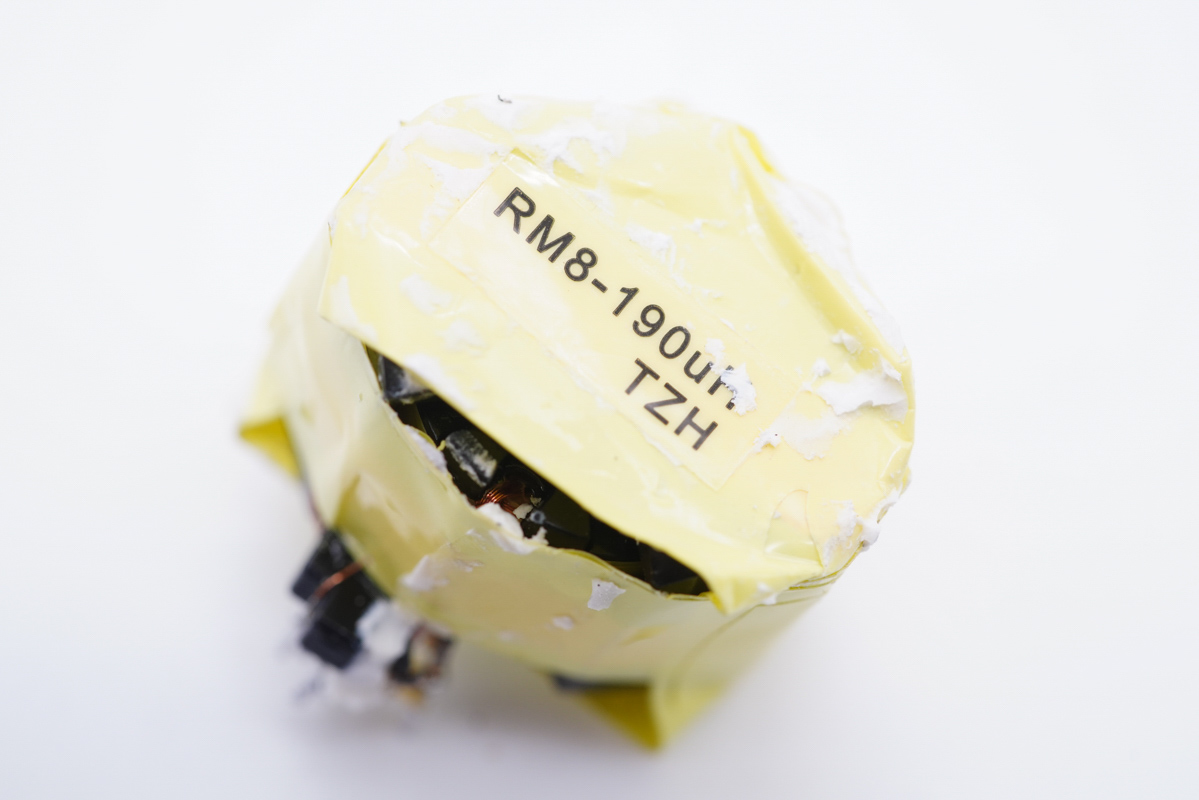 變壓器特寫,頂部貼有信息標(biāo)簽,采用RM8磁芯。