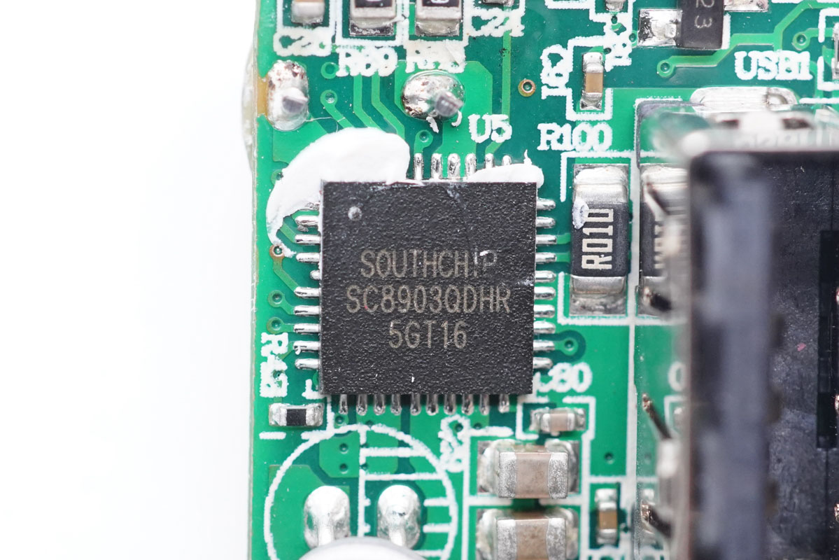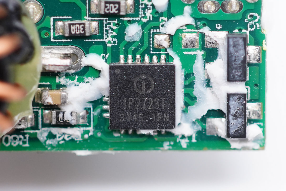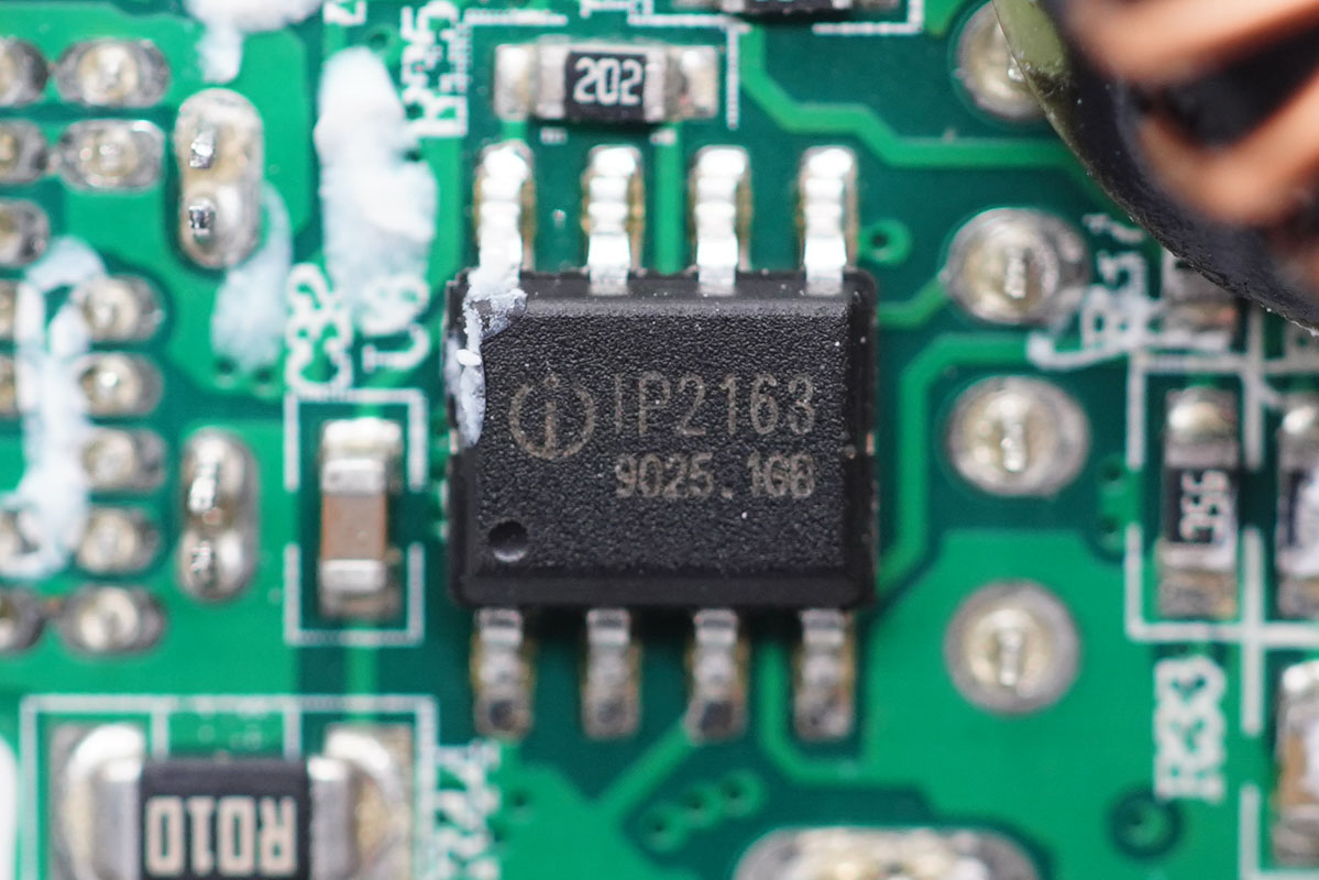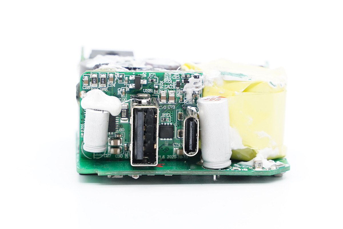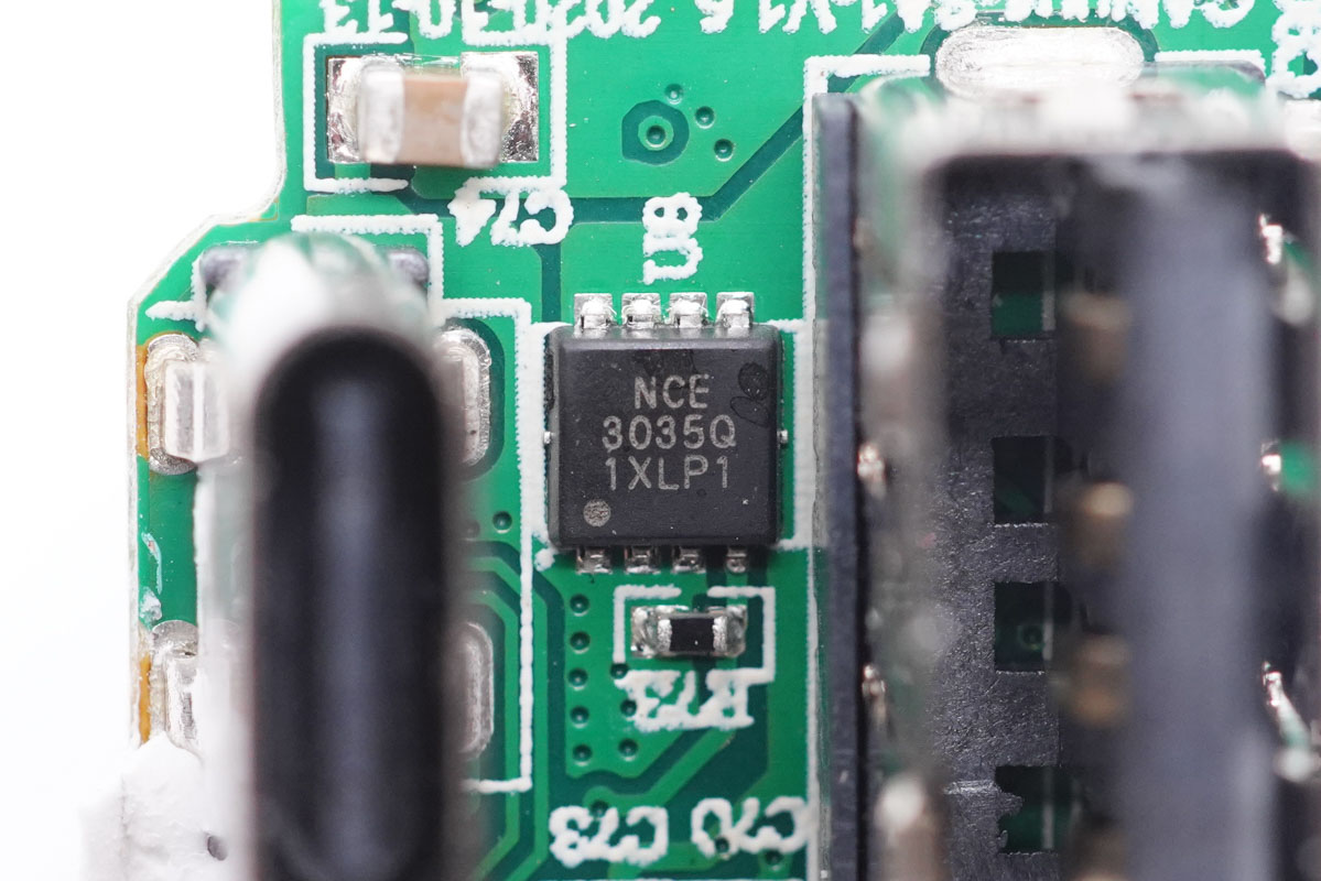 充電頭網(wǎng)通過(guò)拆解了解到,充電器內(nèi)部元器件布局緊湊,輸入輸出端均設(shè)有小板,電容、變壓器等元器件打膠處理。充電器開(kāi)關(guān)電源由安森美NCP1342搭配納微氮化鎵功率芯片,以及MPS MP6908A搭配萬(wàn)代同步整流管組成,由英集芯IP2723T控制USB-C口輸出電壓。USB-A接口采用南芯SC8903進(jìn)行升降壓電壓轉(zhuǎn)換,由英集芯IP2163進(jìn)行協(xié)議識(shí)別,控制A口輸出電壓。