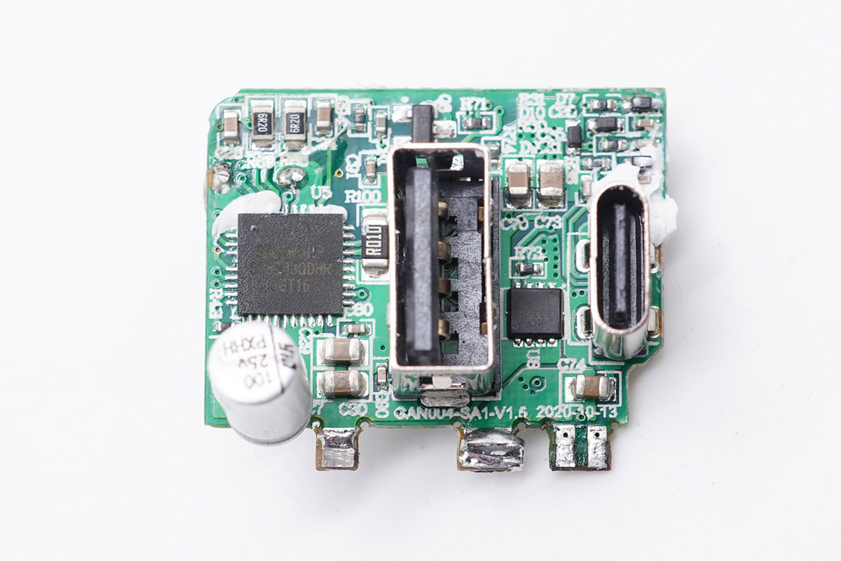 輸出端小板正面一覽,除USB母座外,還設(shè)有升降壓芯片、輸出濾波固態(tài)電容和輸出VBUS開(kāi)關(guān)管。
