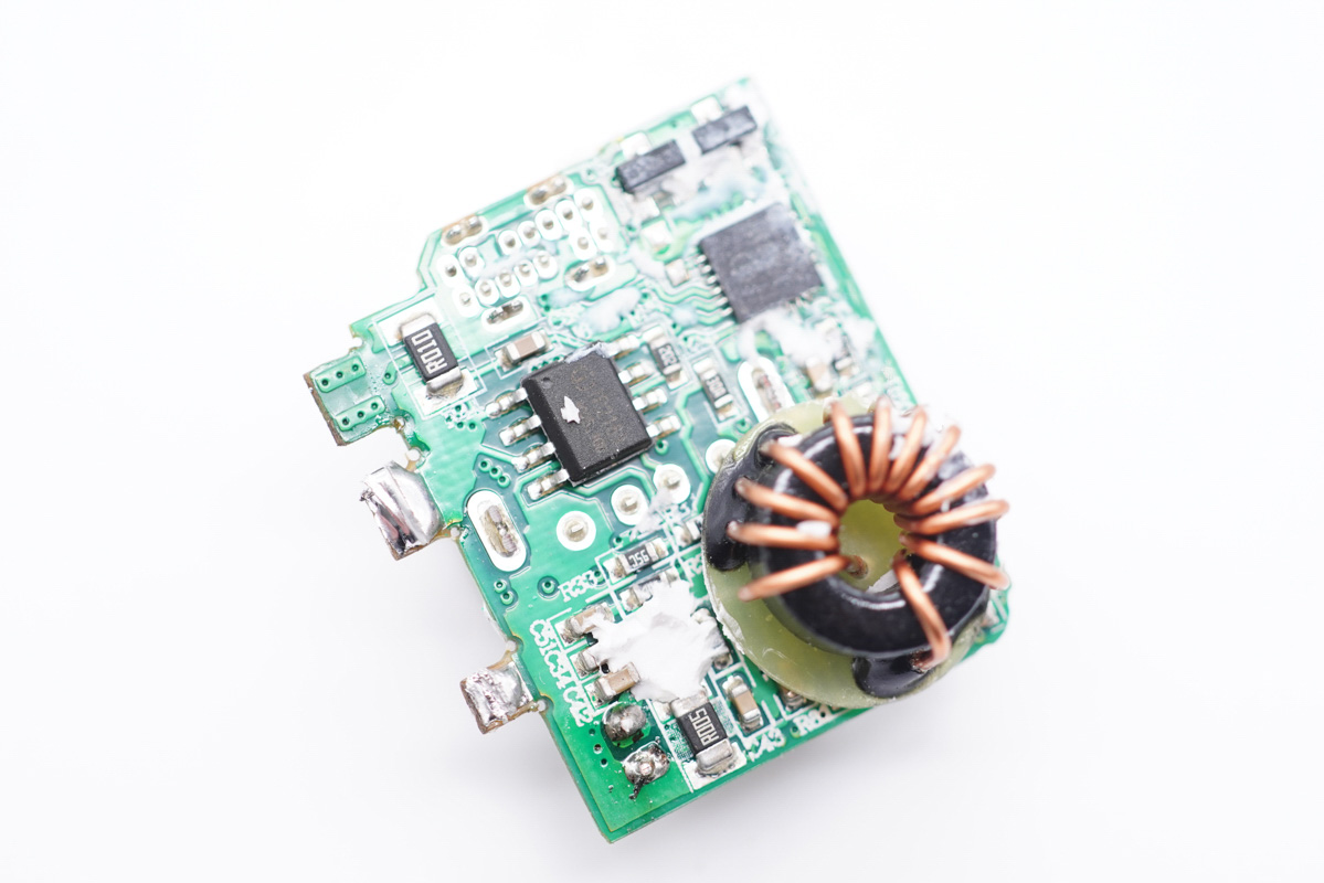 清理掉硅膠,光耦橫跨在初次級(jí)之間,初級(jí)側(cè)設(shè)有主控芯片和氮化鎵功率芯片,次級(jí)側(cè)設(shè)有同步整流控制器和MOS管。