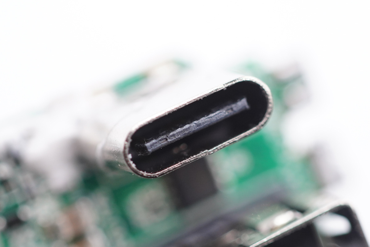 USB-C母座特寫,黑色膠芯不露銅。