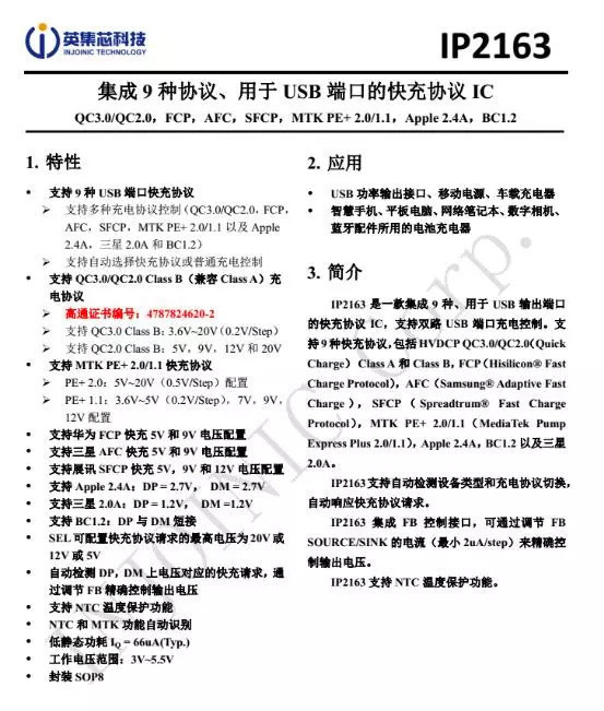 USB-A口協(xié)議芯片采用英集芯IP2163。其支持 QC3.0/QC2.0 Class B(兼容 Class A)充電協(xié)議??,同時(shí)可由外部引腳編程輸出模式。這顆芯片通過(guò)了美國(guó)高通QC3.0認(rèn)證,證書編號(hào)478786303-2 。