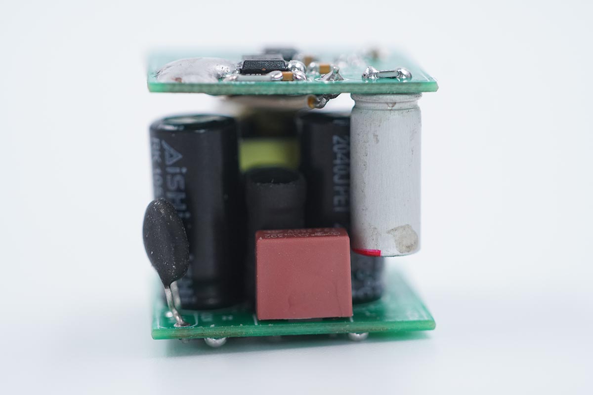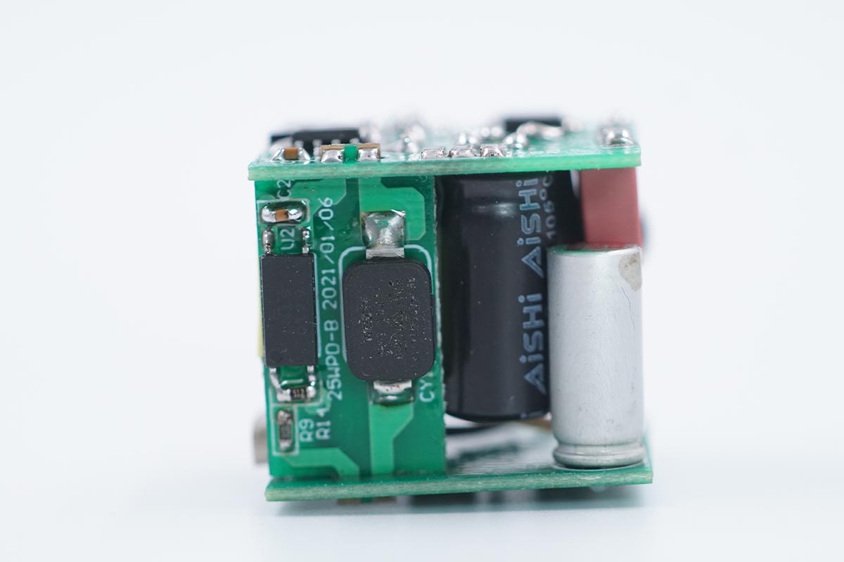 誠芯微這款25W方案采用三塊PCB堆疊焊接的方案,初級小板上有整流橋和CX7530C反激控制器芯片。