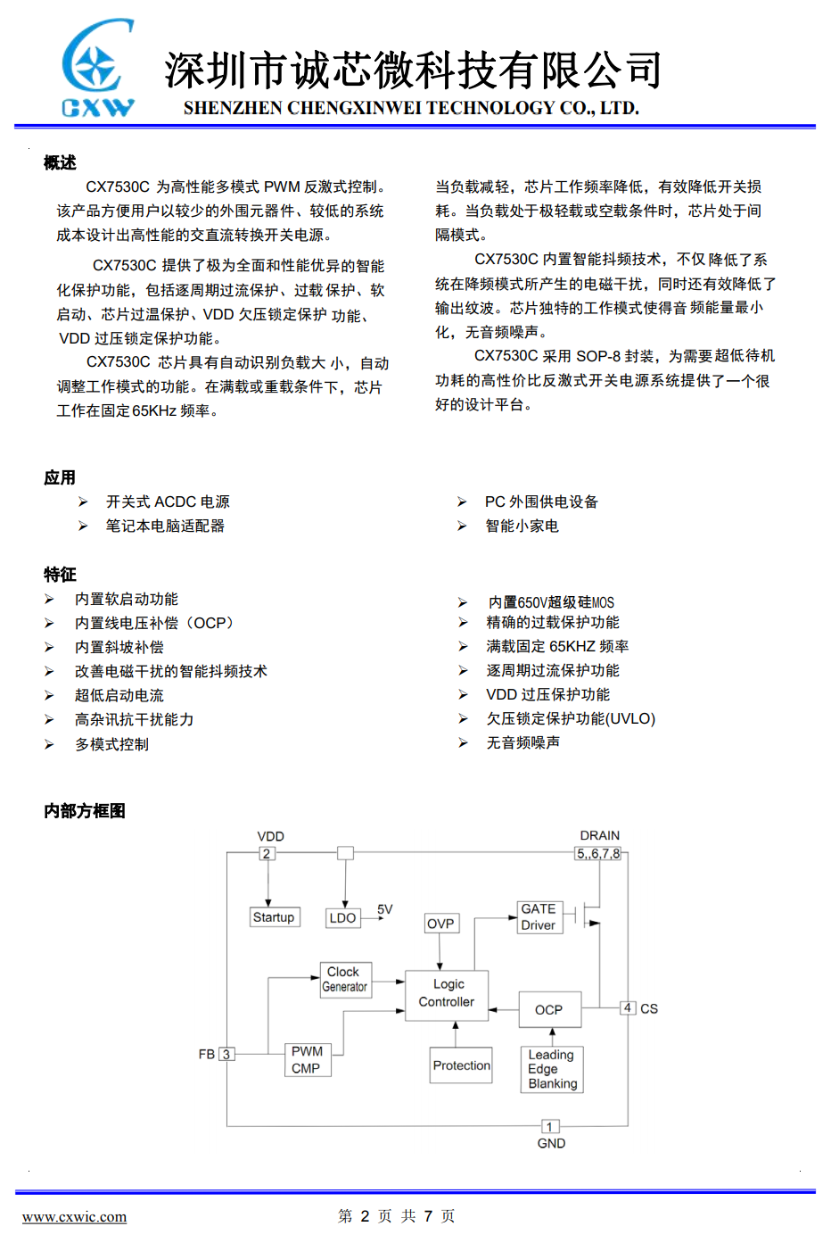 誠芯微CX7530C支持極為全面和性能優秀的智能化保護功能,包括逐周期過流保護,過載保護,軟啟動,芯片過熱保護,供電欠壓過壓保護功能。適用于PD快充適配器和智能小家電等小功率高可靠性開關電源。