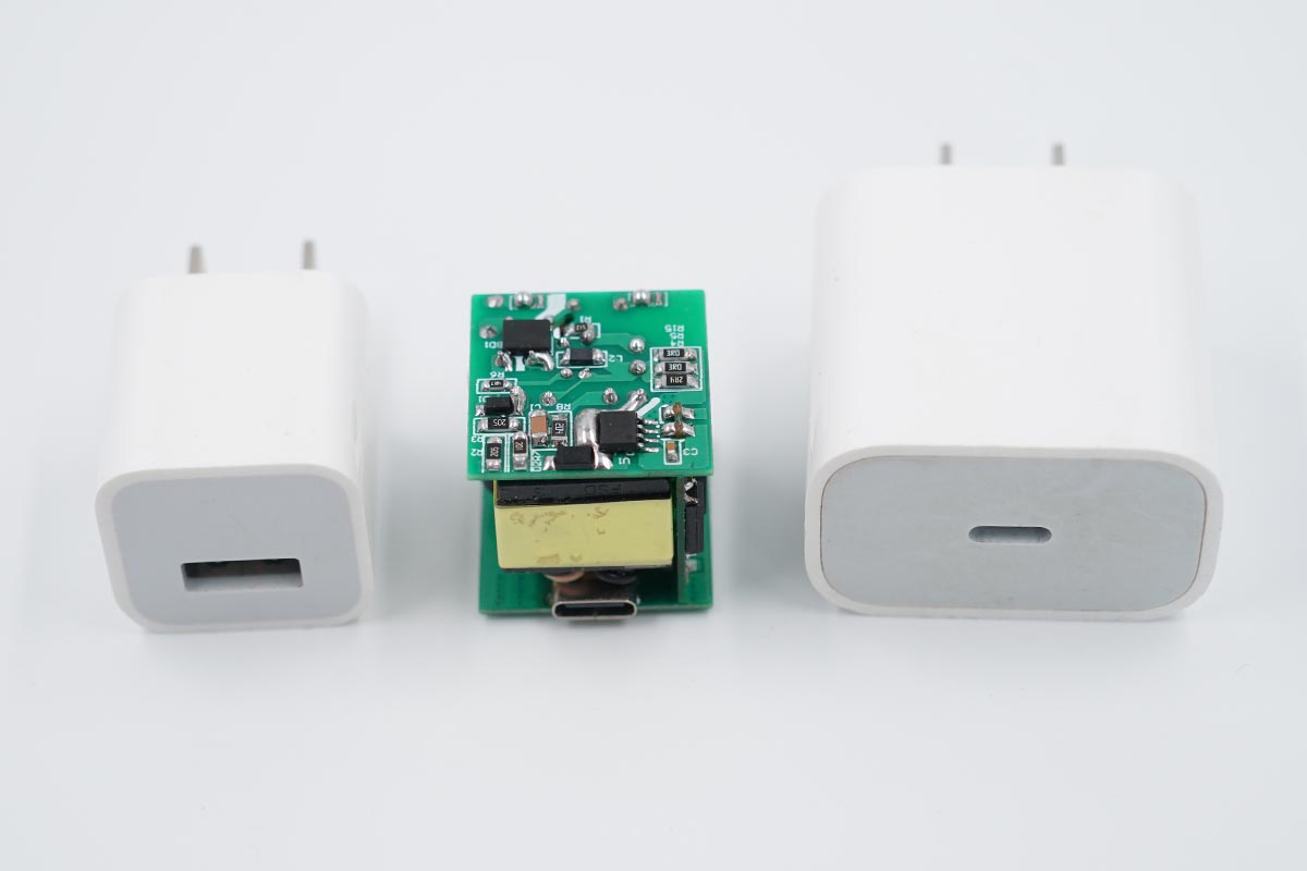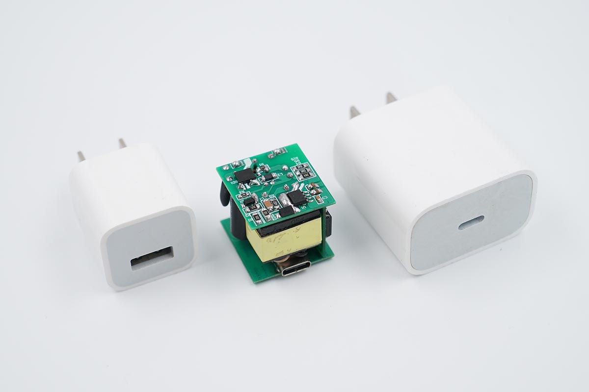誠芯微 25W Demo大小與蘋果5W和20W 適配器體積對比。
