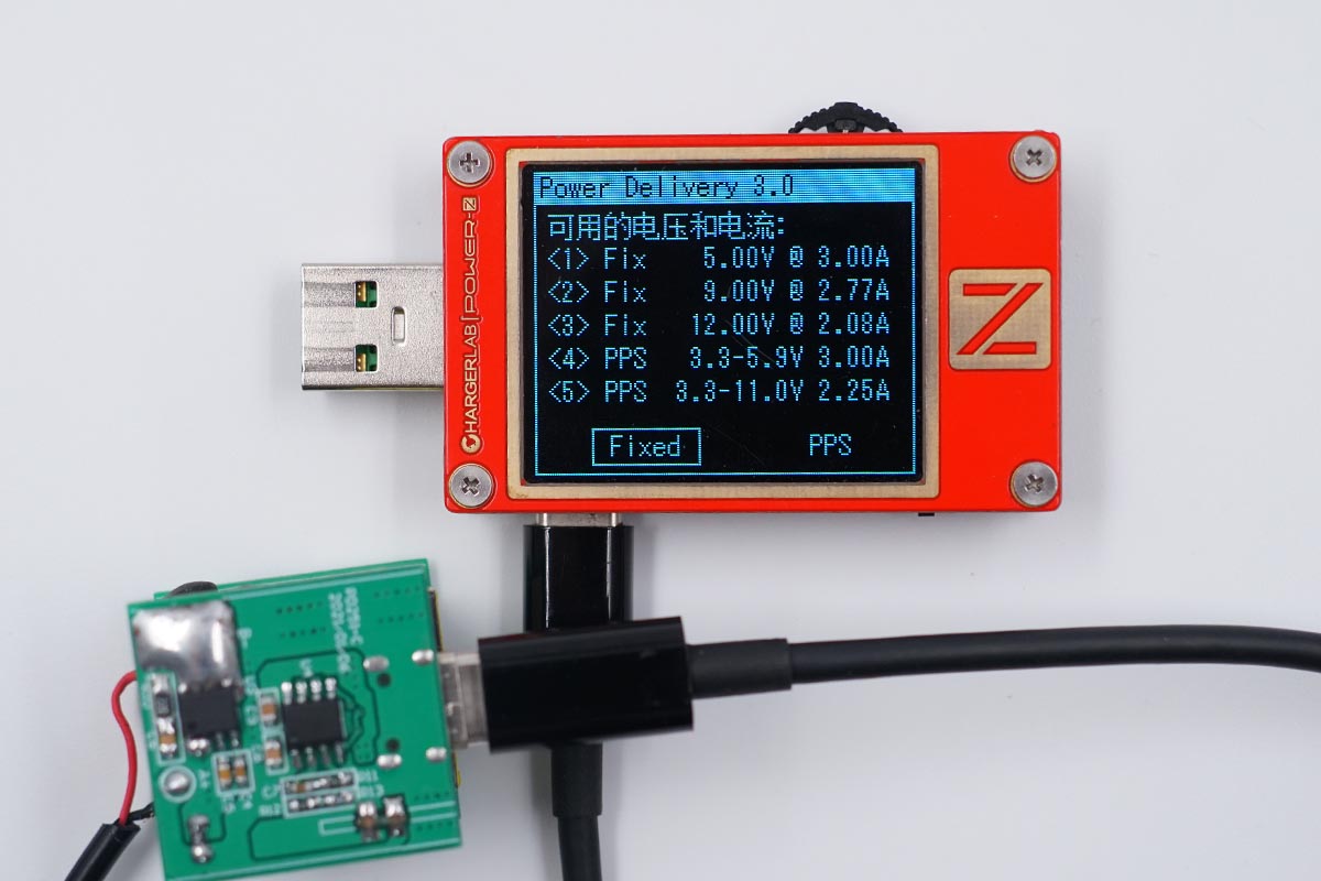 誠芯微25W Demo采用單C口輸出設計,使用ChargerLAB POWER-Z KT002測試輸出協議,XPD720支持Apple 2.4A,Samsung5V2A,QC2.0/3.0,華為FCP快充協議,同時還支持PD3.0 PPS快充協議。