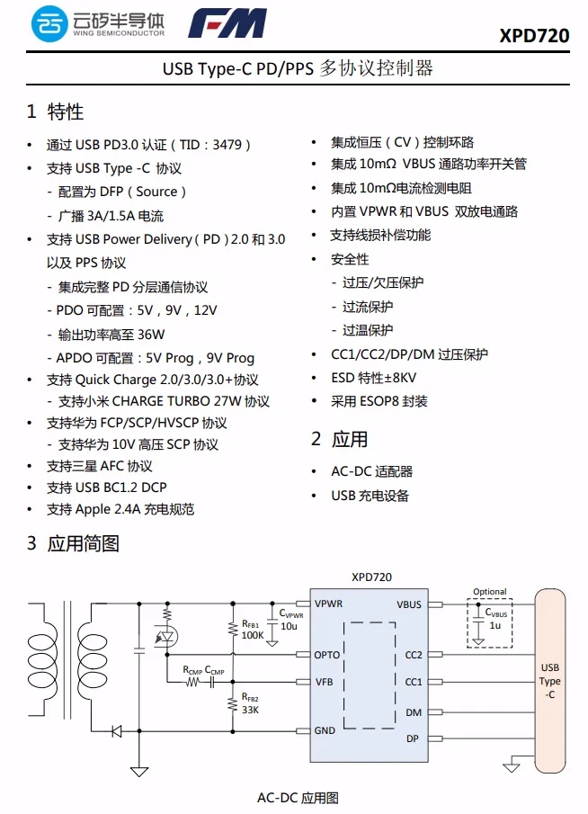 云矽XPD720支持USB PD以及PPS,QC3.0/2.0協議,華為SCP/FCP快充協議,三星AFC快充協議,支持光耦和DC-DC反饋,可應用于PD快充和車充移動電源等應用。XPD720內置動態過壓/欠壓/過流保護,啟動輸出前監測端口電壓,D+/D-和CC1/CC2過壓保護。功能強大,且外圍精簡,非常適合高集成度PD快充電源使用。