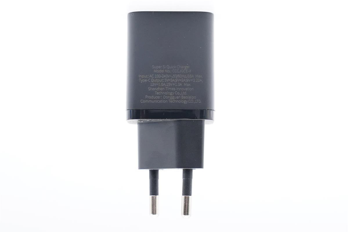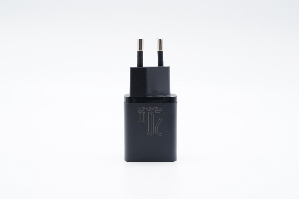 充電器機身殼采用PC阻燃材質黑色外殼,表面啞光處理,腰身各面之間過渡圓潤,機身正面印有20W SUPER Si字樣。