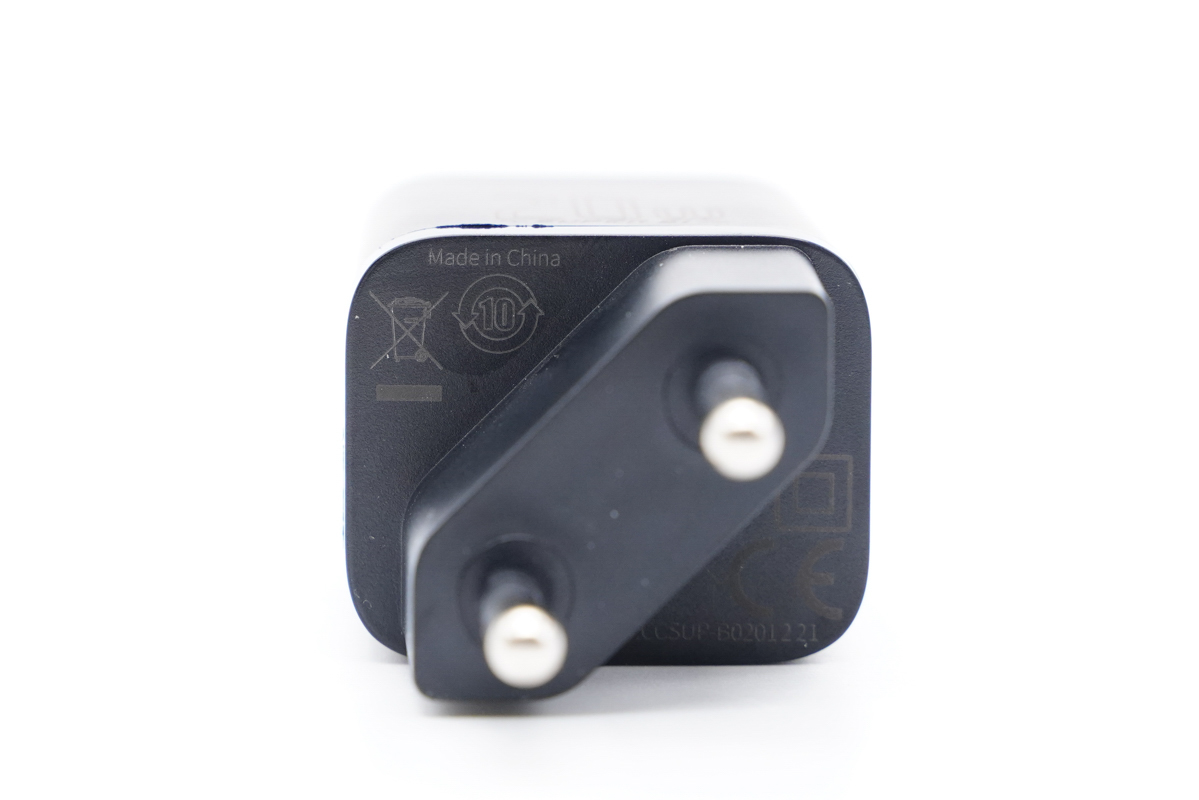 輸入端棱形凸出外殼采用對角傾斜設計,契合歐規插座,使充電器機身不占用更多空間,此外產品已經通過了CE認證。