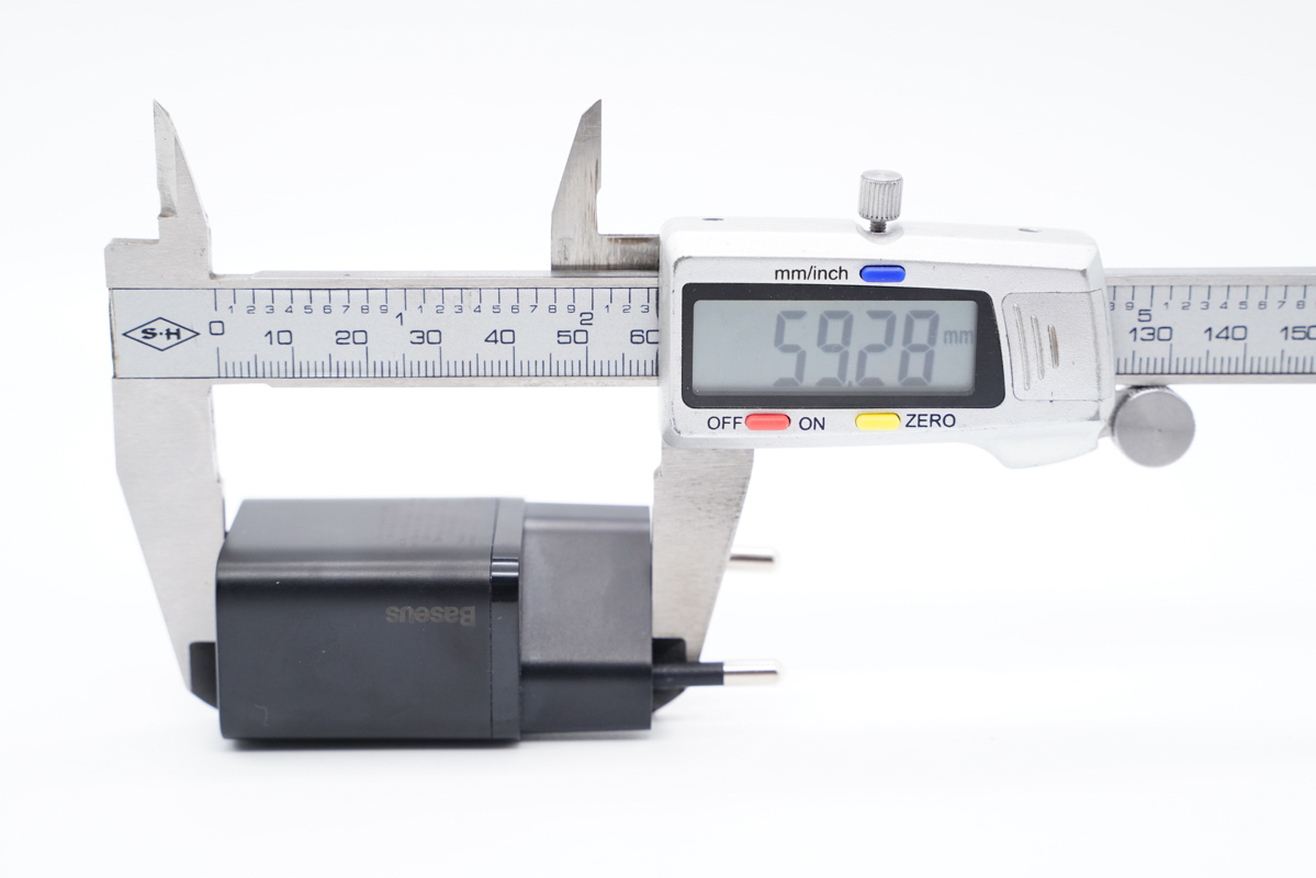 使用游標卡尺實測充電器機身長度為59.28mm。