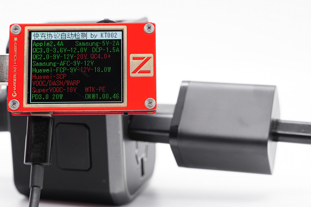 使用ChargerLAB POWER-Z KT002檢測USB-C口輸出協議,顯示支持Apple 2.4A、Samsung 5V2A和DCP協議,以及QC2.0/3.0、AFC、FCP、PD3.0快充協議。