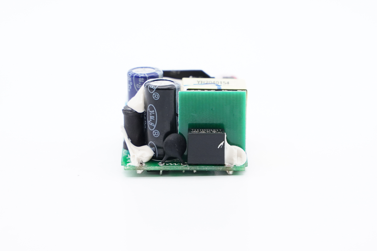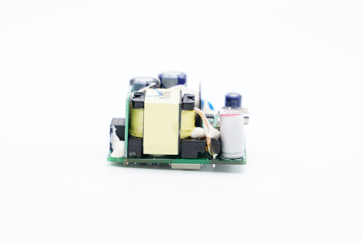 板子正面一覽,輸入輸出端均設有小板,變壓器、電容等打膠處理,初次級之間有絕緣板進行隔離。