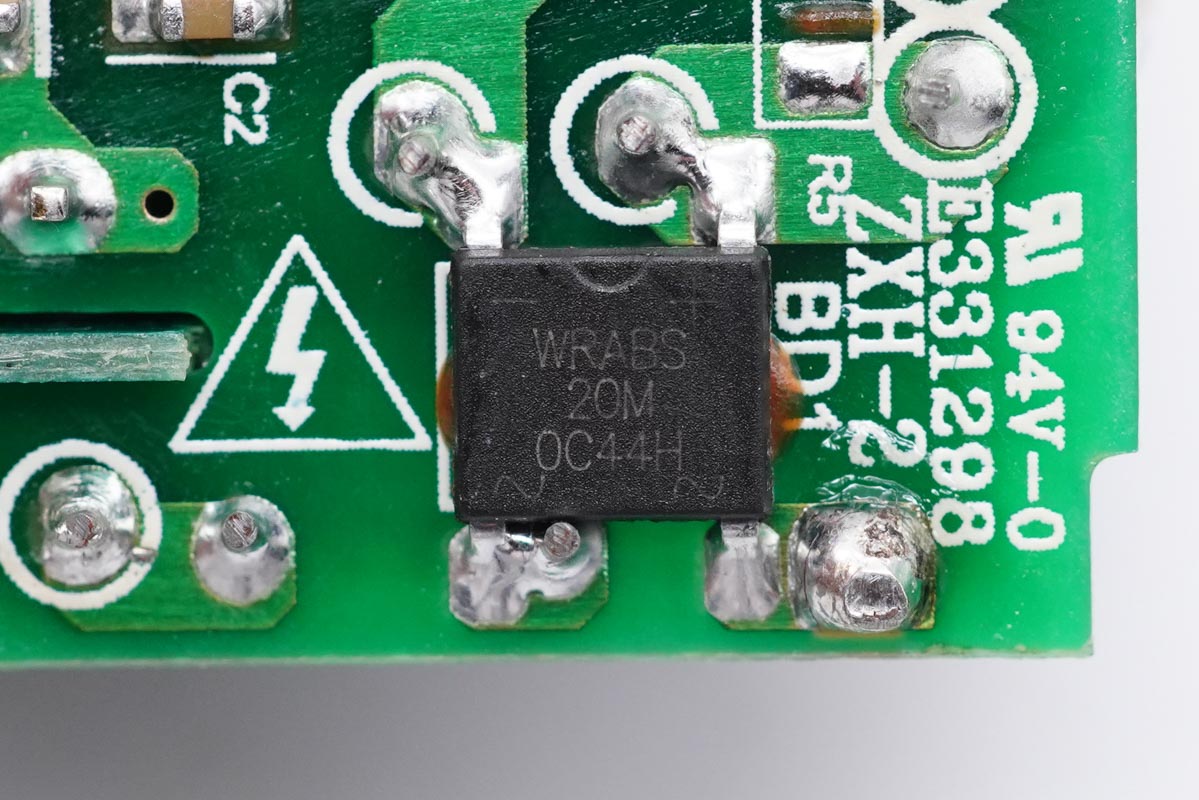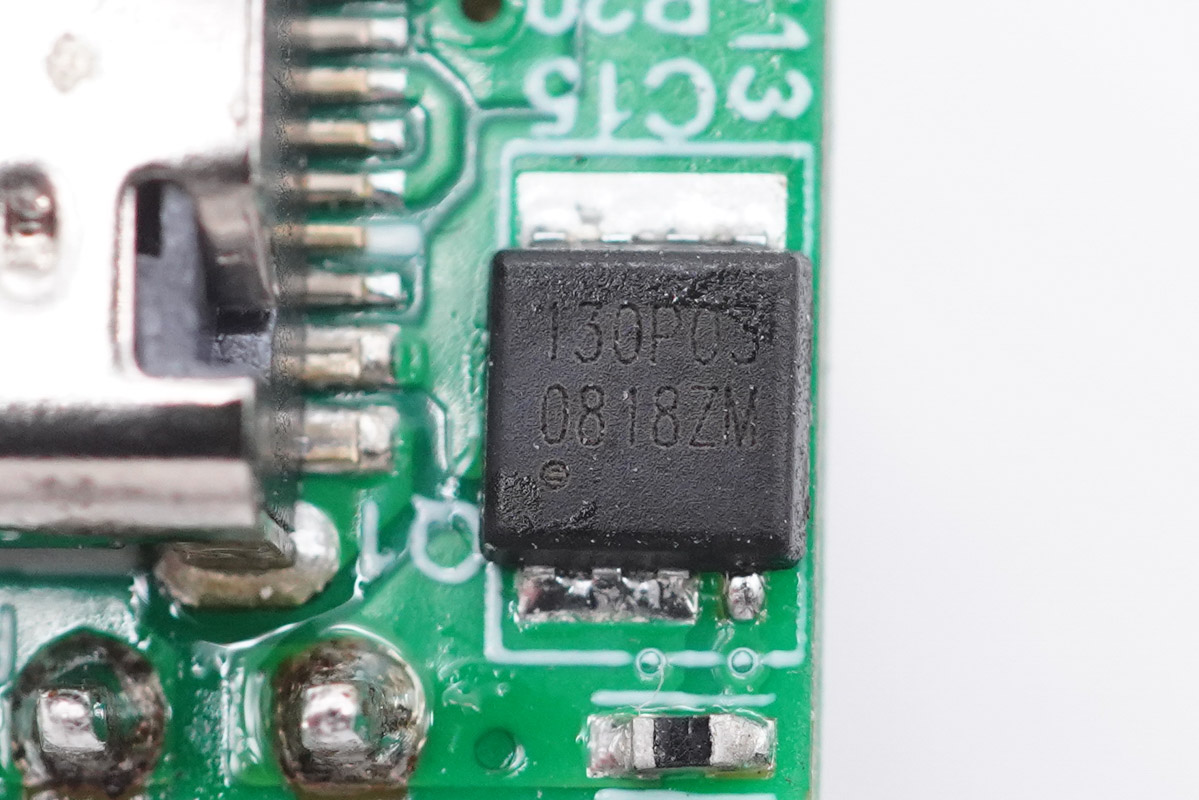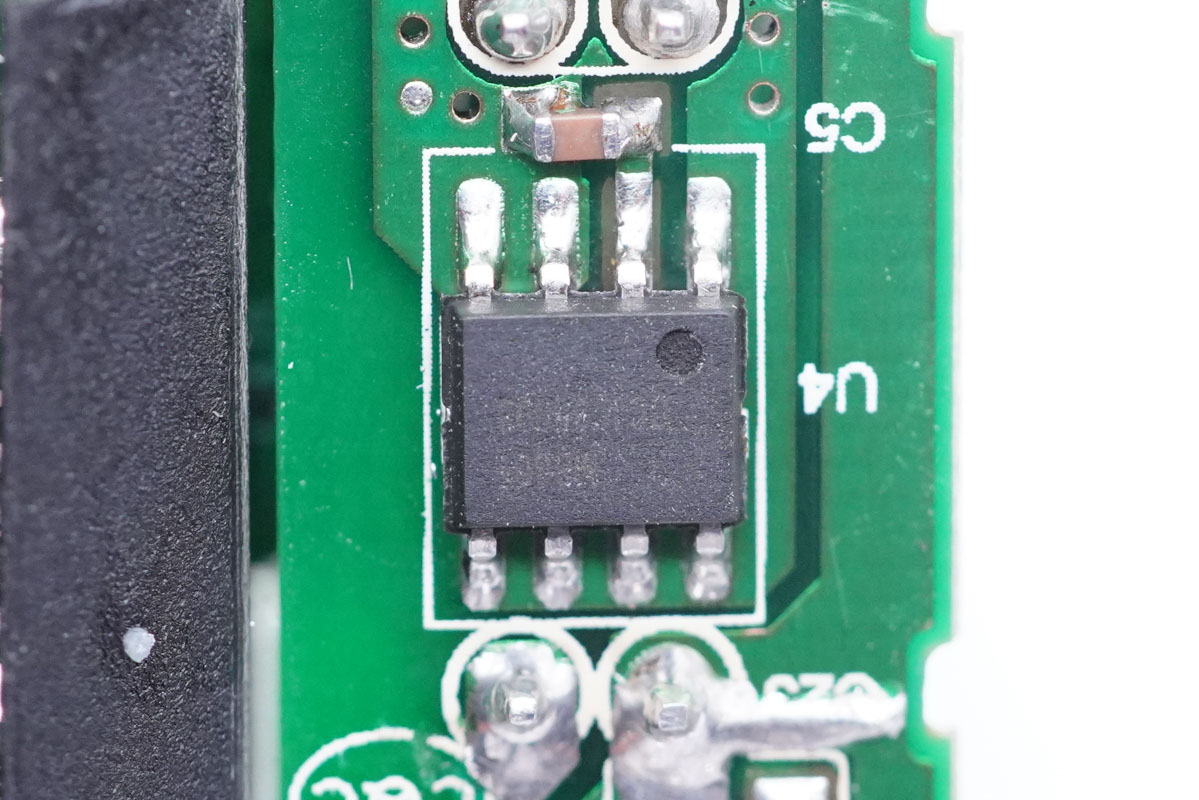 同步整流芯片特寫,絲印被打磨,信息不詳,內置同步整流控制器和同步整流管。
