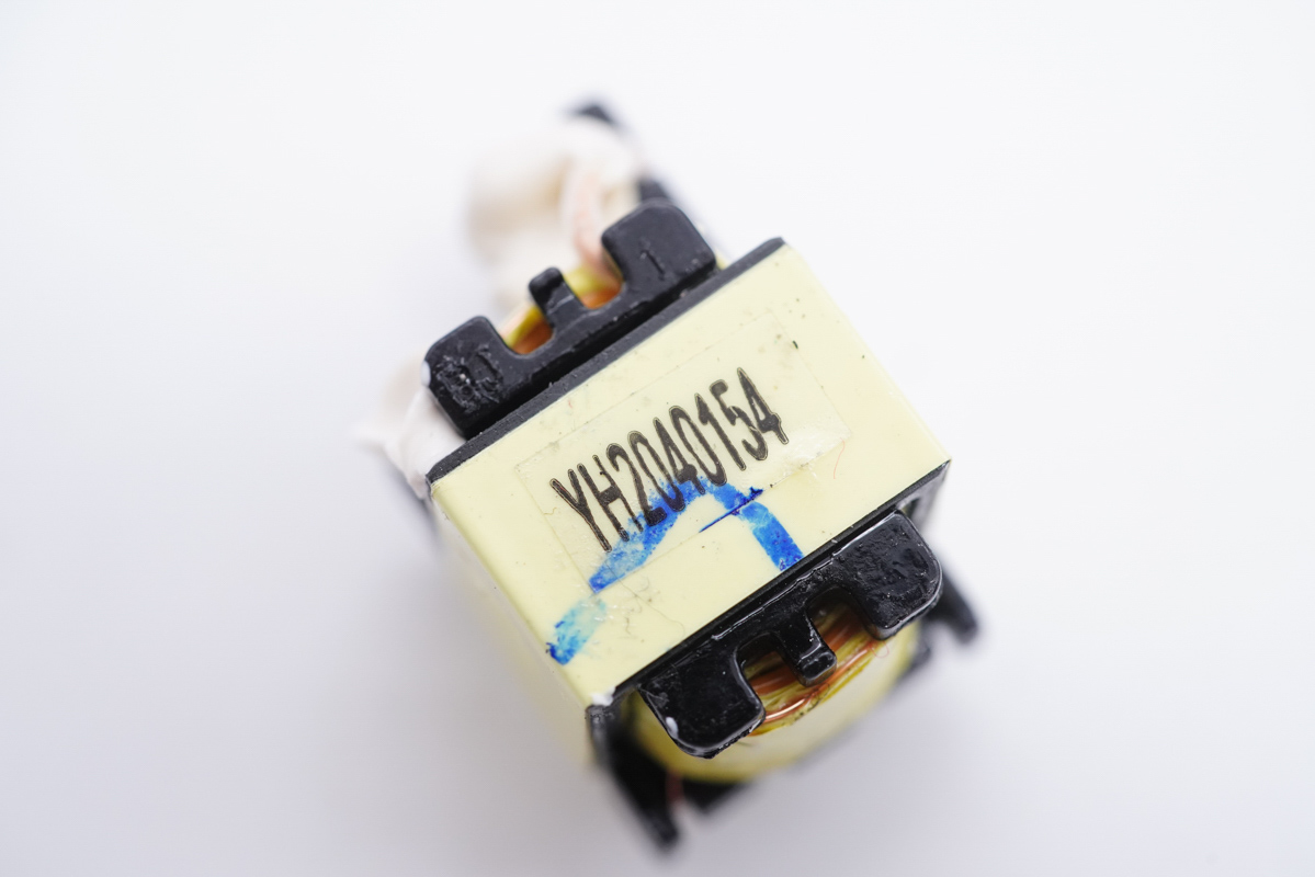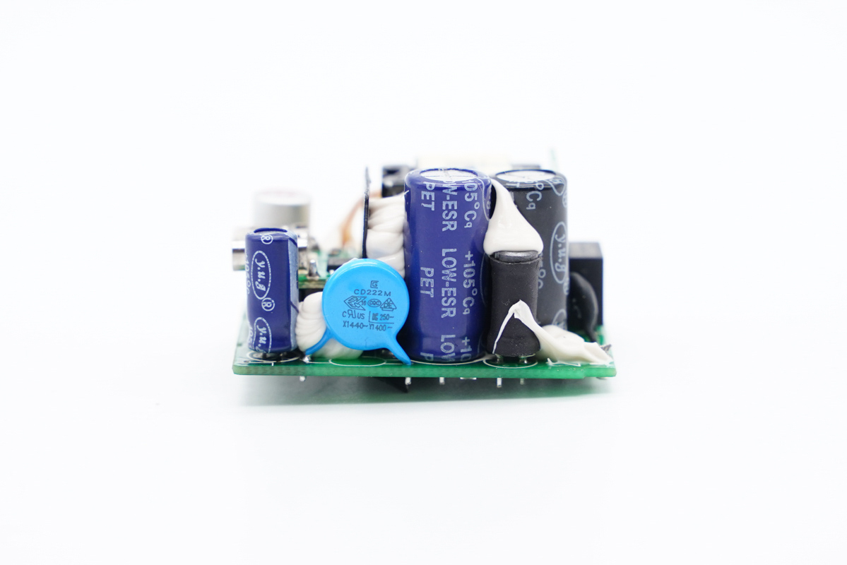 PCB板側面一覽,初級側設有工字電感以及兩顆高壓濾波電解電容。