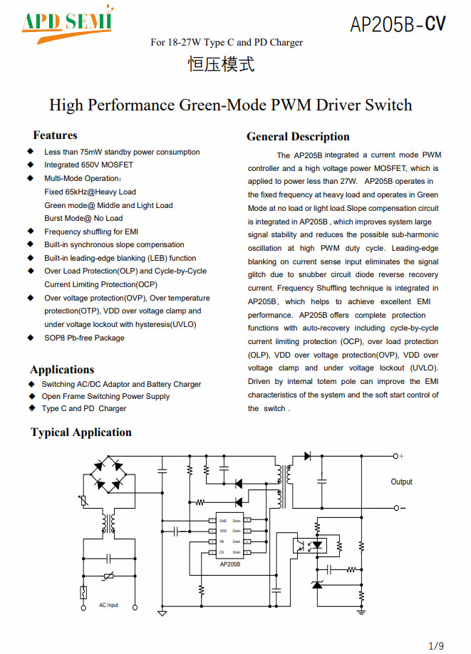 充電器主控芯片采用成都矽力科技有限公司(APD-SEMI)的AP205B-CV。這是一款內置超級硅、外圍簡單高效的AC-DC芯片,有恒功率和恒壓兩種模式選擇,2.4ohm、1.6ohm、0.9ohm三種內置mos供選擇;有很好的EMC特性,高壓和低壓的OCP一致性好,具備完整的保護功能;擁有50mW以內的超低待機功耗,可輕松通過歐洲VI級能效。