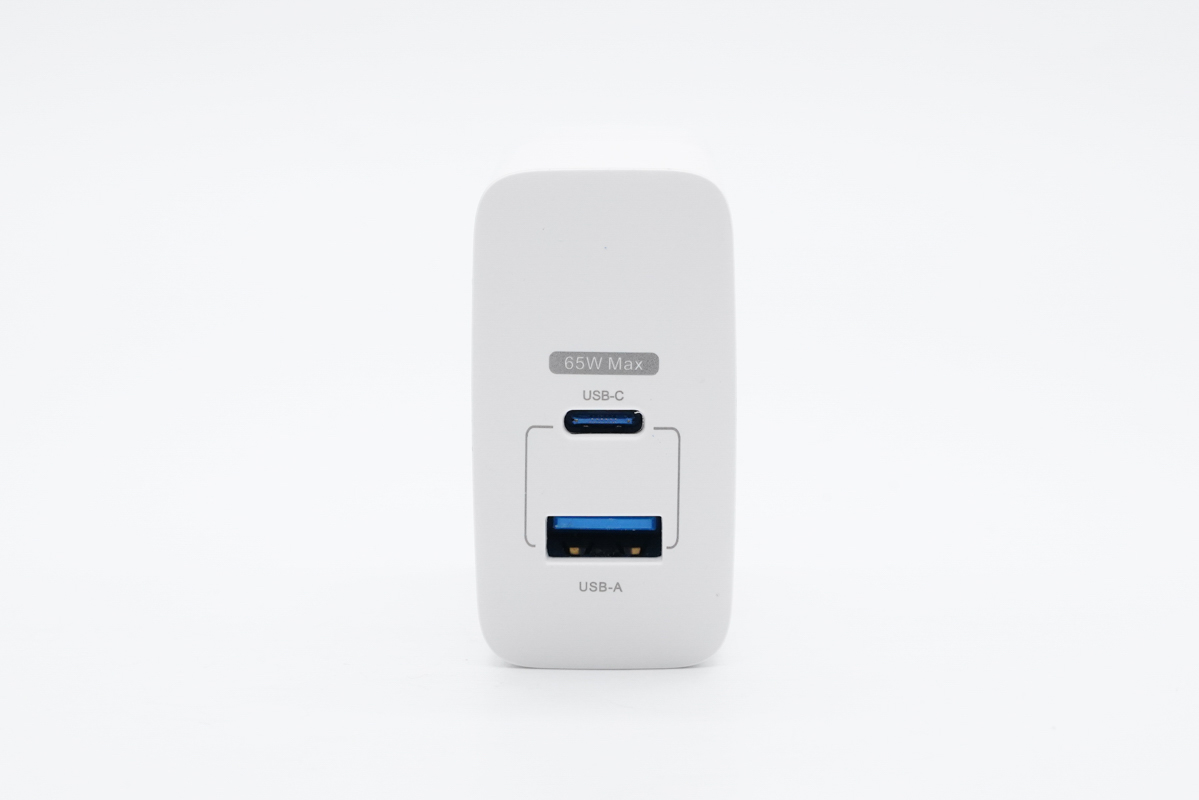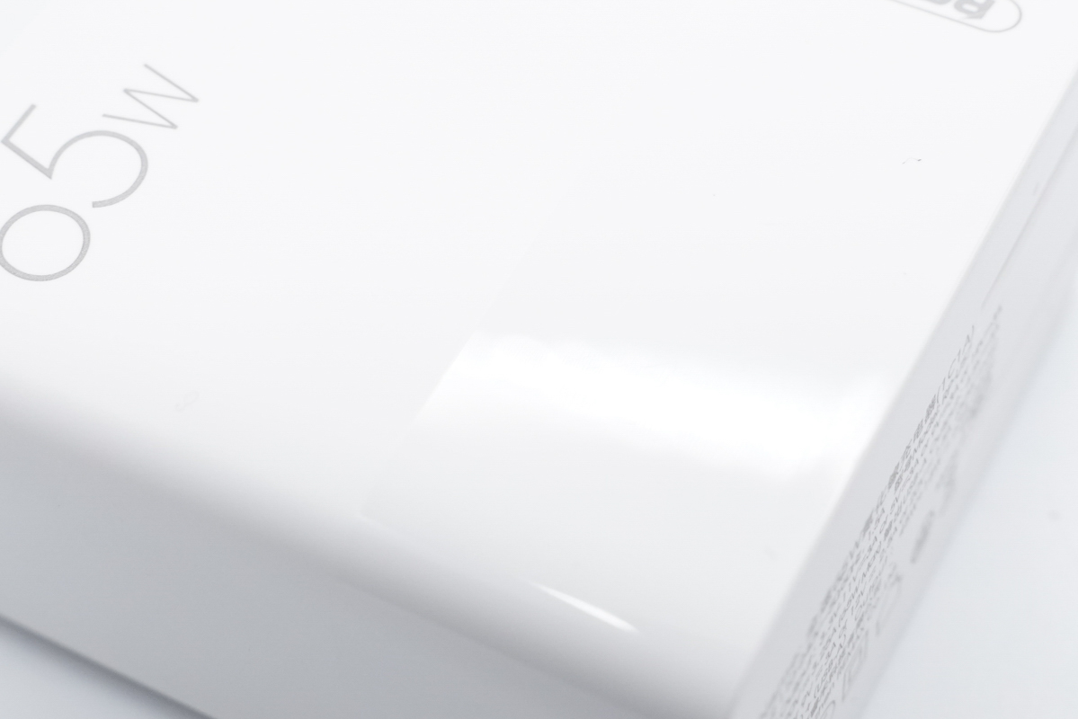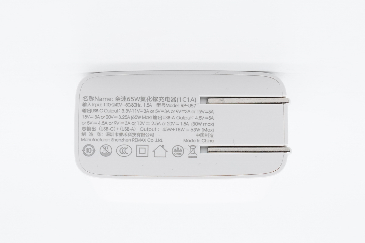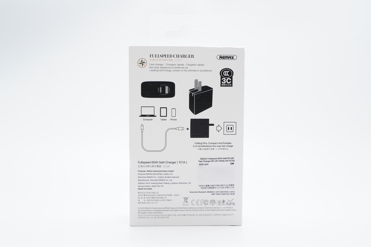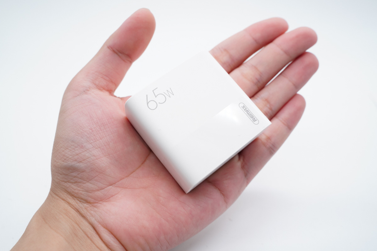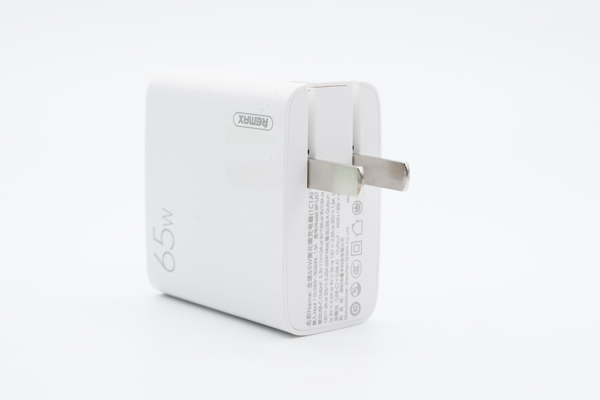 這款充電器采用方塊造型設計,采用PC阻燃材質白色外殼,腰身正面設有REMAX品牌logo和65W快充標識。