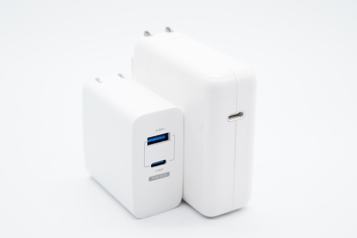 和蘋果61W充電器直觀對比,體積優勢非常明顯。