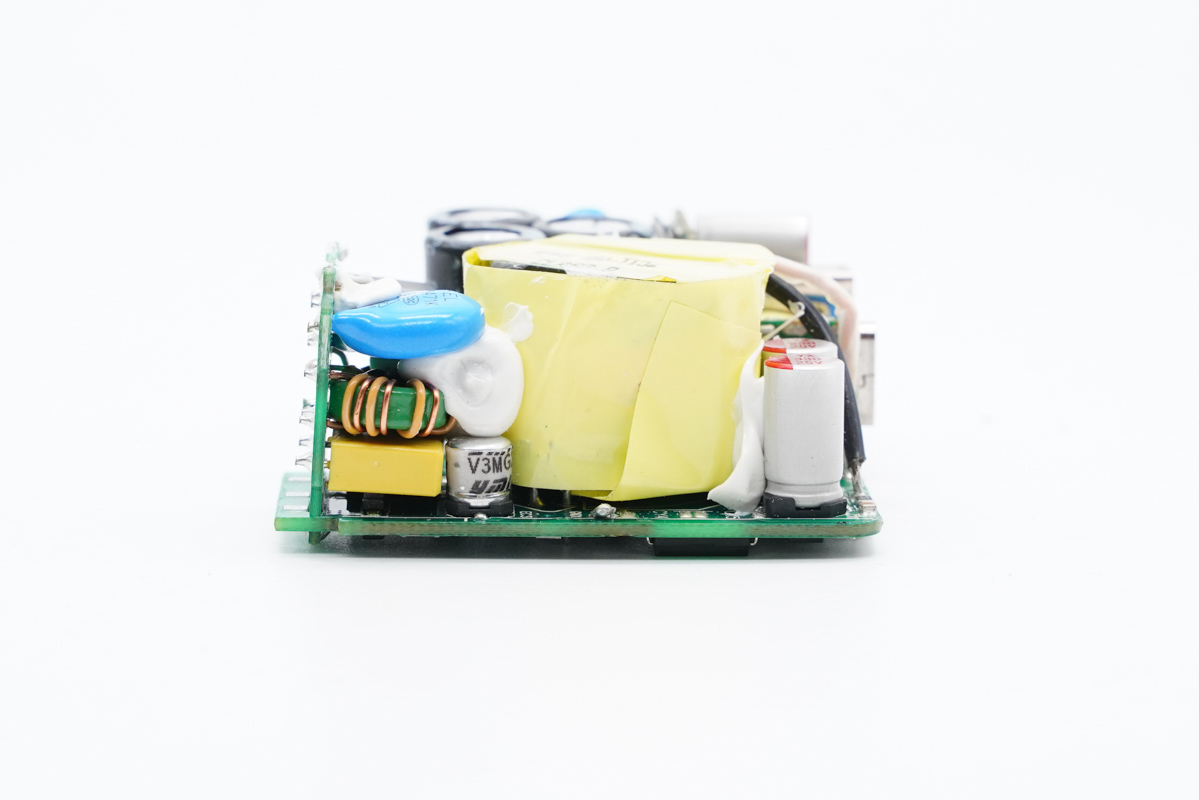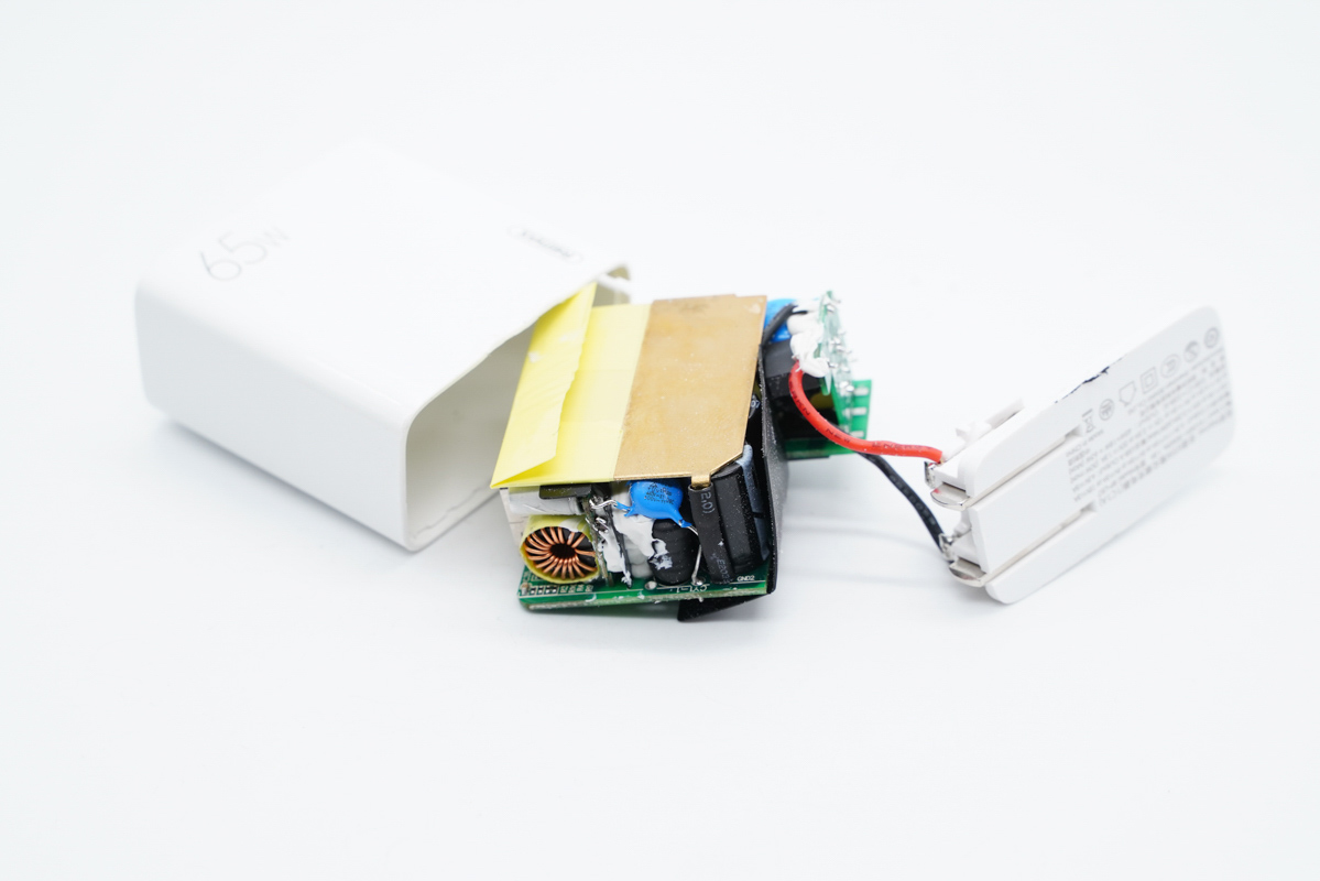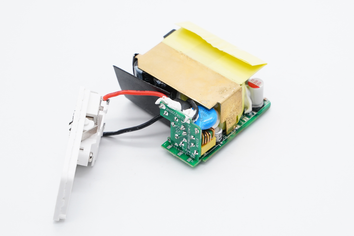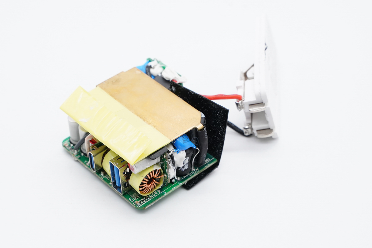 折疊插腳和PCB板通過紅黑AC導線連接通電,初級側設有隔離板和PCB小板。
