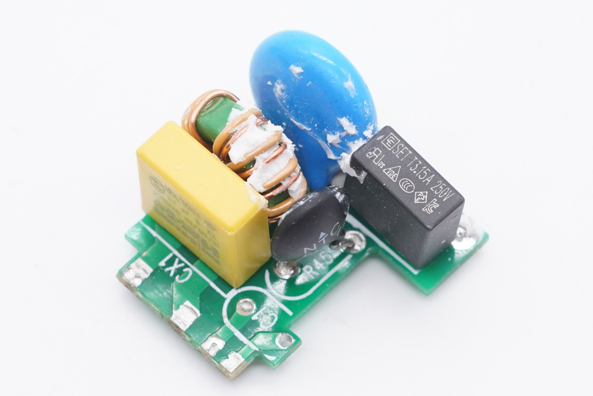 黃銅散熱片和PCB板焊接,焊腳處套上絕緣管,此外低壓側粘貼絕緣膠帶。