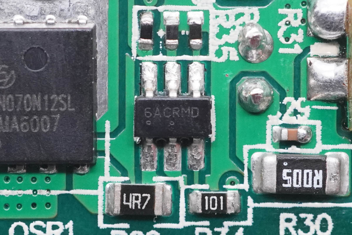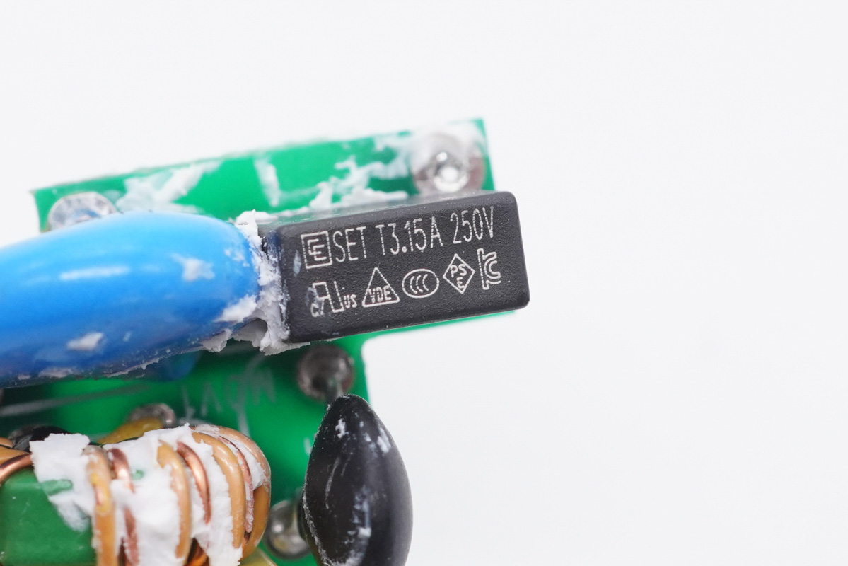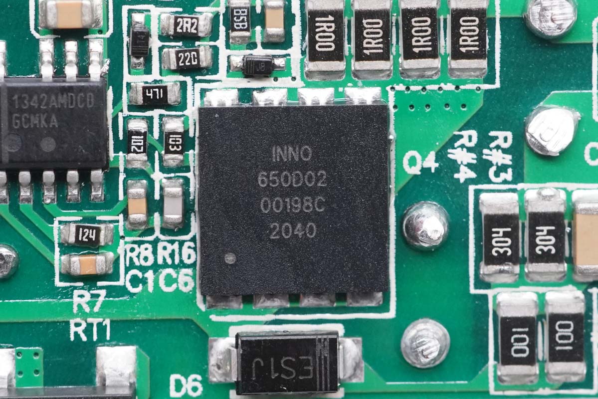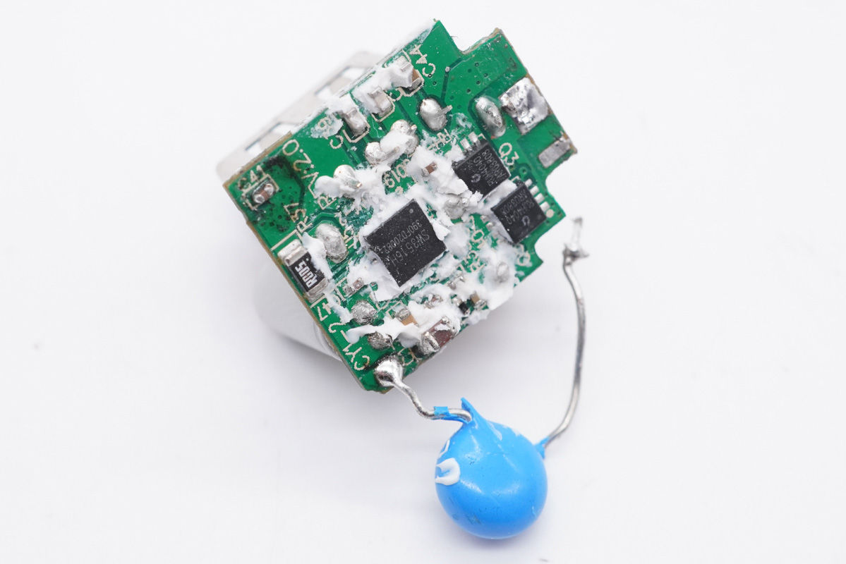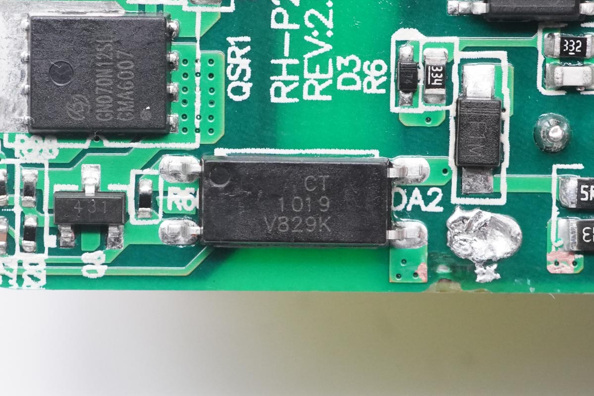 經過對PCB板正背面電路分析發現,REMAX?65W?1A1C氮化鎵充電器采用時下熱門的開關電源定壓輸出,雙路獨立二次降壓輸出的設計架構,并且雙口輸出功率由一顆MCU智能分配。下面就從輸入端開始一一了解各元器件的信息。