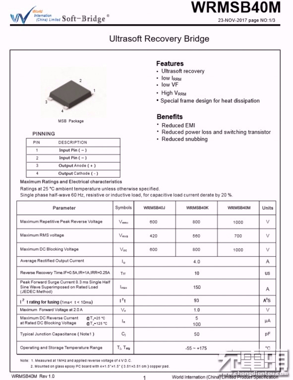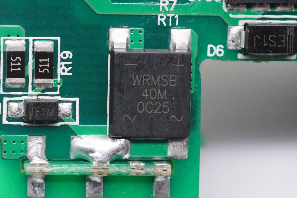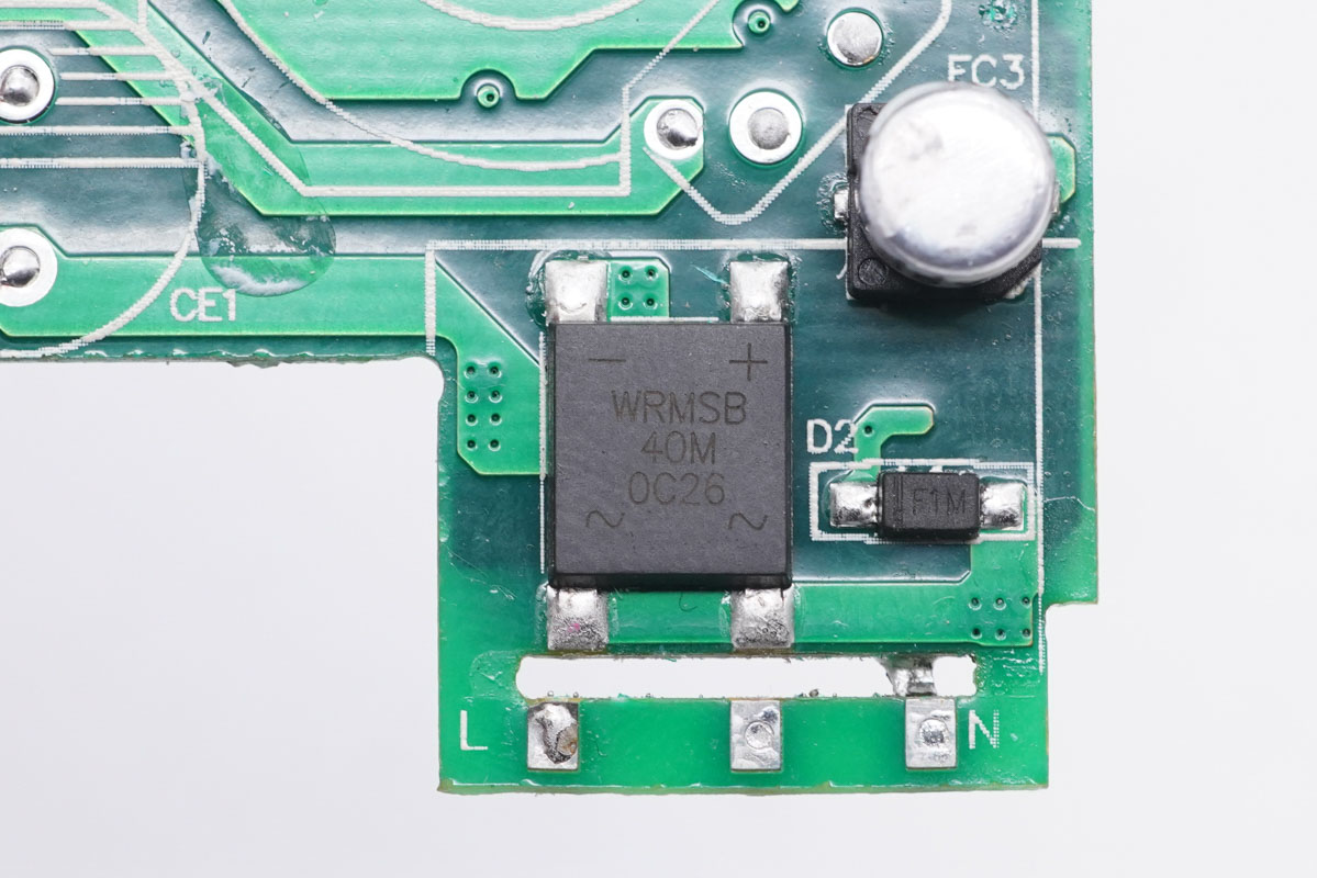 小板下方設有整流橋,沃爾德實業有限公司的WRMSB40M。這顆軟橋通過較軟的恢復曲線,比較平滑的關斷特性,可以降低二極管結電容達到非常少的諧波振蕩產生的效果。