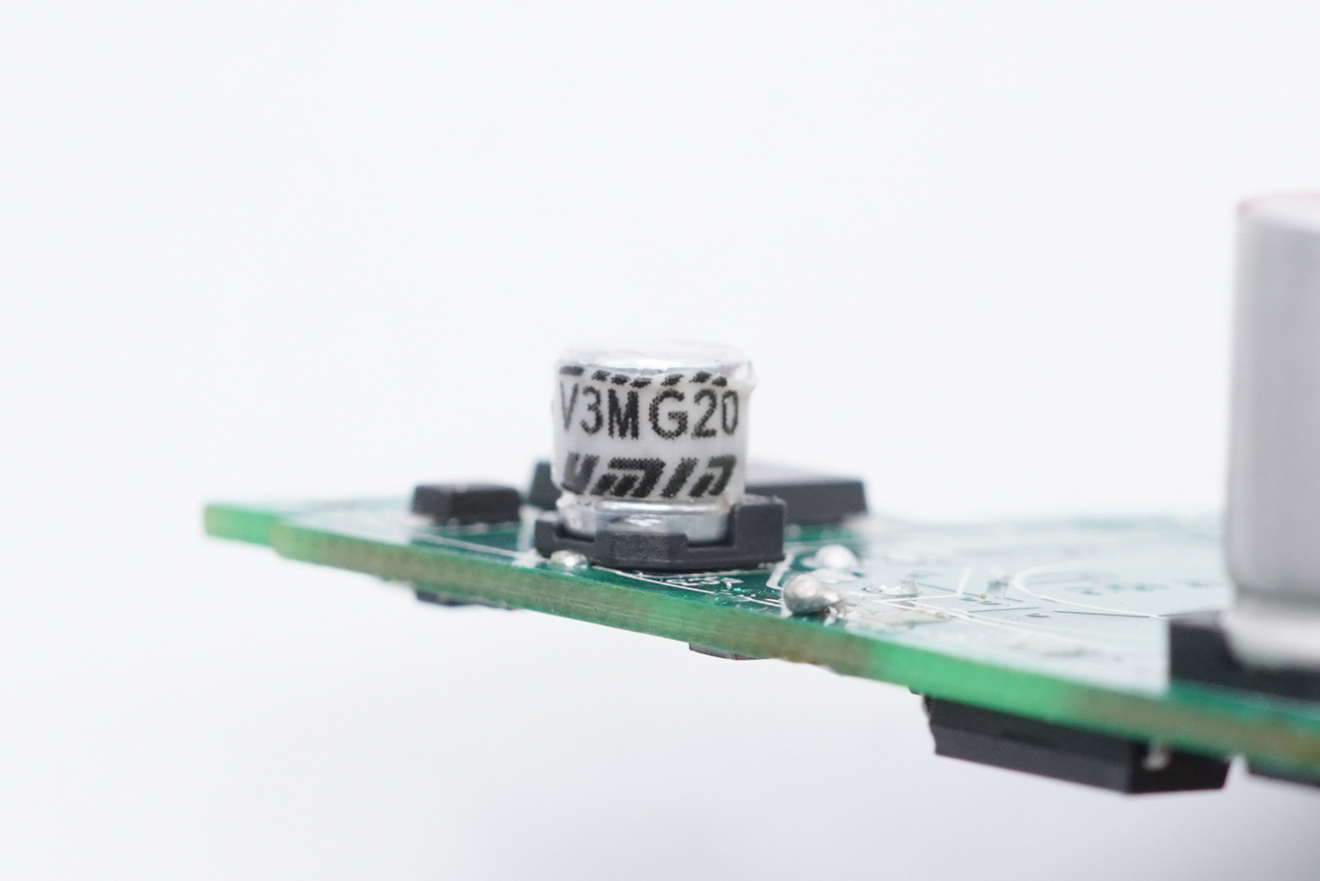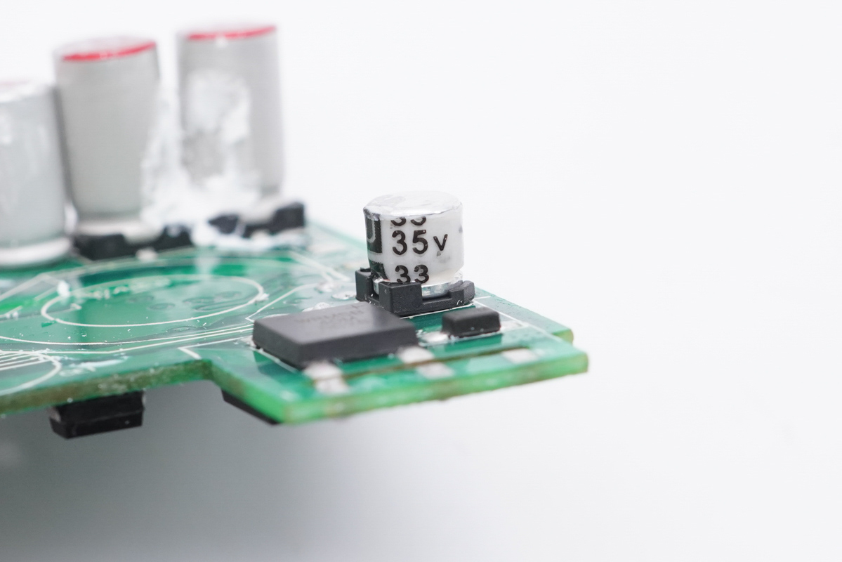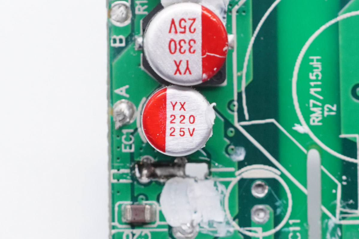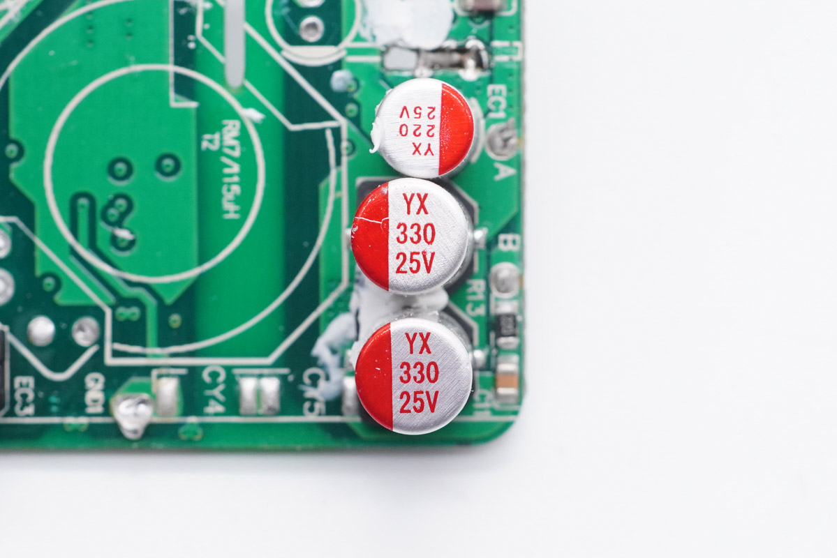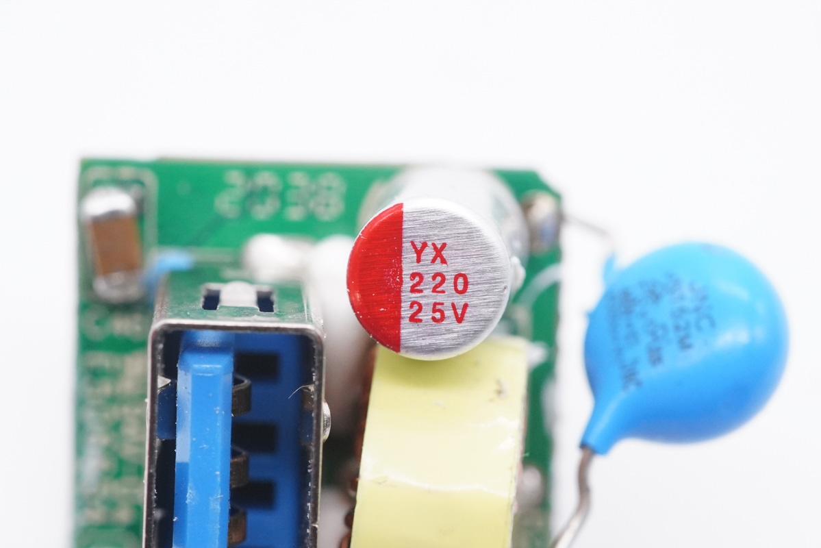 兩顆輸出濾波固態電容規格均為25V?330μF,來自福建云星電子有限公司?!癥X”牌固態電容專門針對USB?PD快充設計,在105℃的工作環境下仍能保證2000小時的壽命,同時兼具耐高溫、耐大紋波、低ESR等特性。
