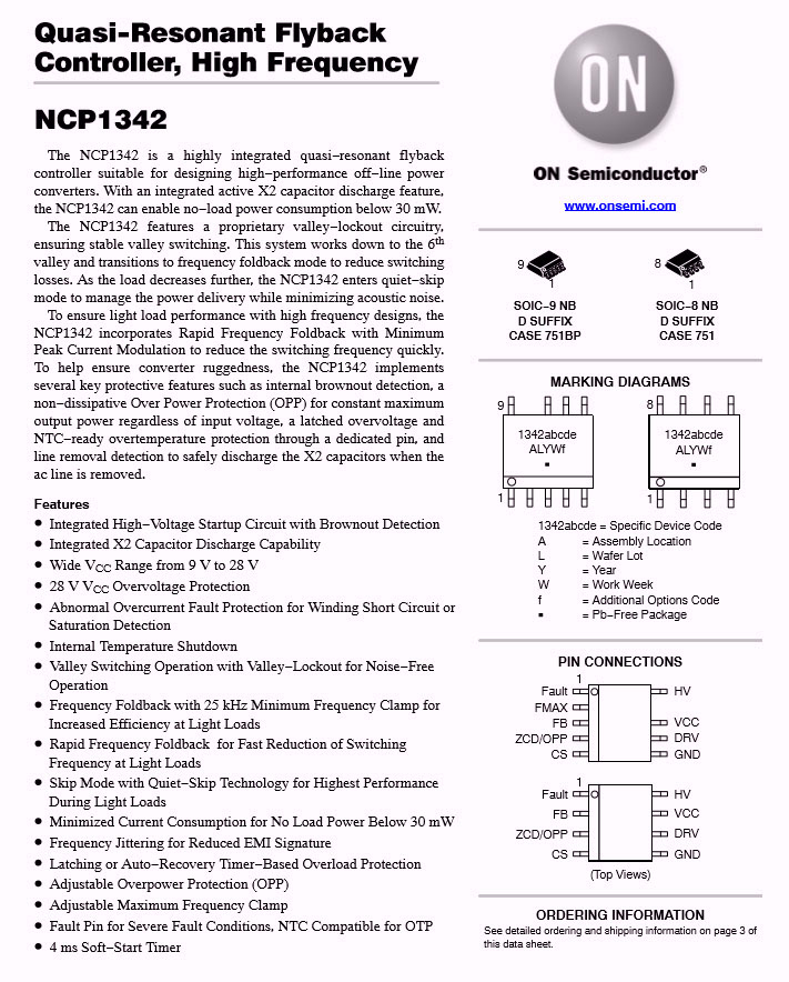 充電器主控芯片為ON安森美NCP1342,這是一顆高頻初級PWM控制器,內置主動X2電容放電和多重完善的保護功能,具有超低的待機功耗。