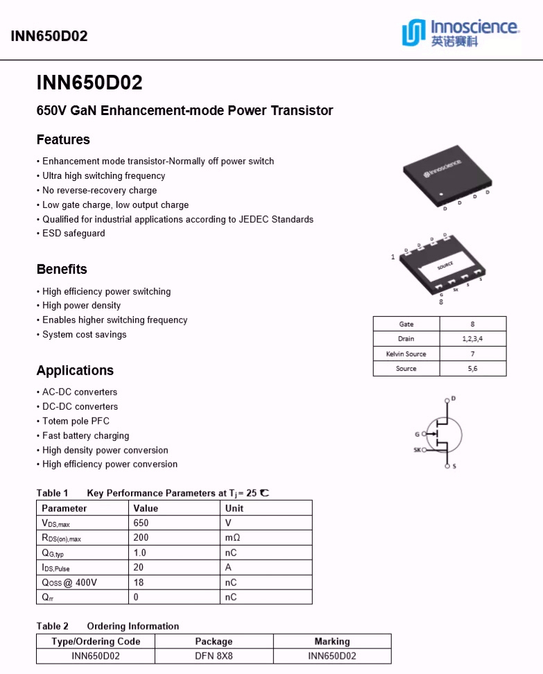 INN650D02,額定耐壓為650V,峰值耐壓750V,導阻低至0.2Ω,符合JEDEC標準的工業應用要求,支持ESD保護,支持開爾文源極。最高工作溫度150℃。