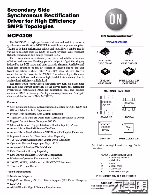 次級同步整流控制器,安森美NCP4306,支持最高1MHz開關頻率,適用于DCM或CCM反激,準諧振反激和半橋LLC拓撲。
