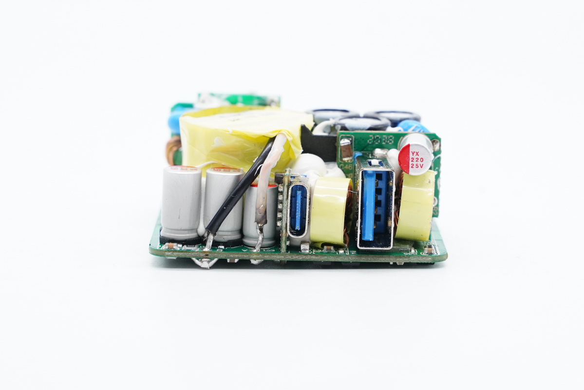 散熱片拆掉,初次級之間有絕緣板隔離,變壓器、電容等元器件打膠加固,輸出端兩個USB母座均使用小板垂直焊接。