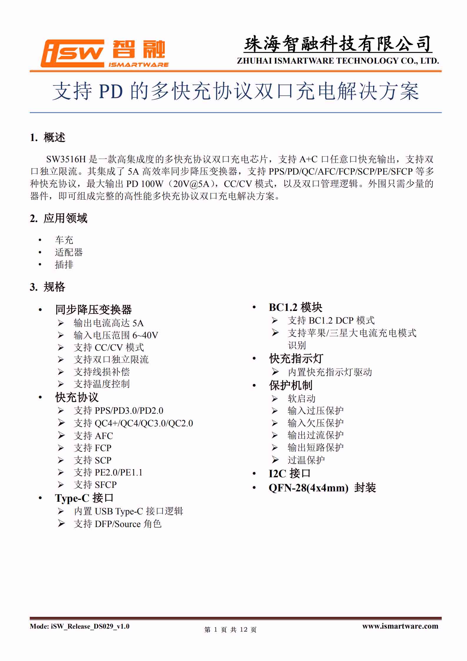 智融SW3516H是一款高集成度的多快充協議雙口充電芯片,支持A+C口任意口快充輸出,支持雙口獨立限流。其集成了5A 高效率同步降壓變換器。支持PPS/PD/QC/AFC/FCP/SCP/PE/SFCP等多種快充協議,最大輸出PD 100W,CC/CV 模式,以及雙口管理邏輯。外圍只需少量的器件,即可組成完整的高性能多快充協議雙口充電解決方案。