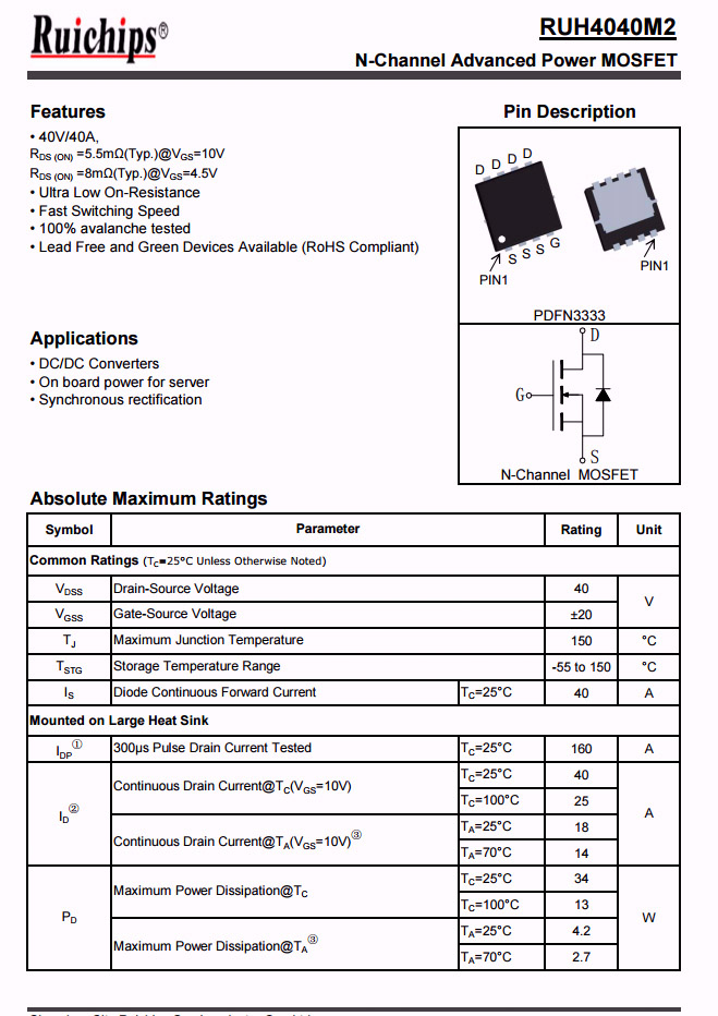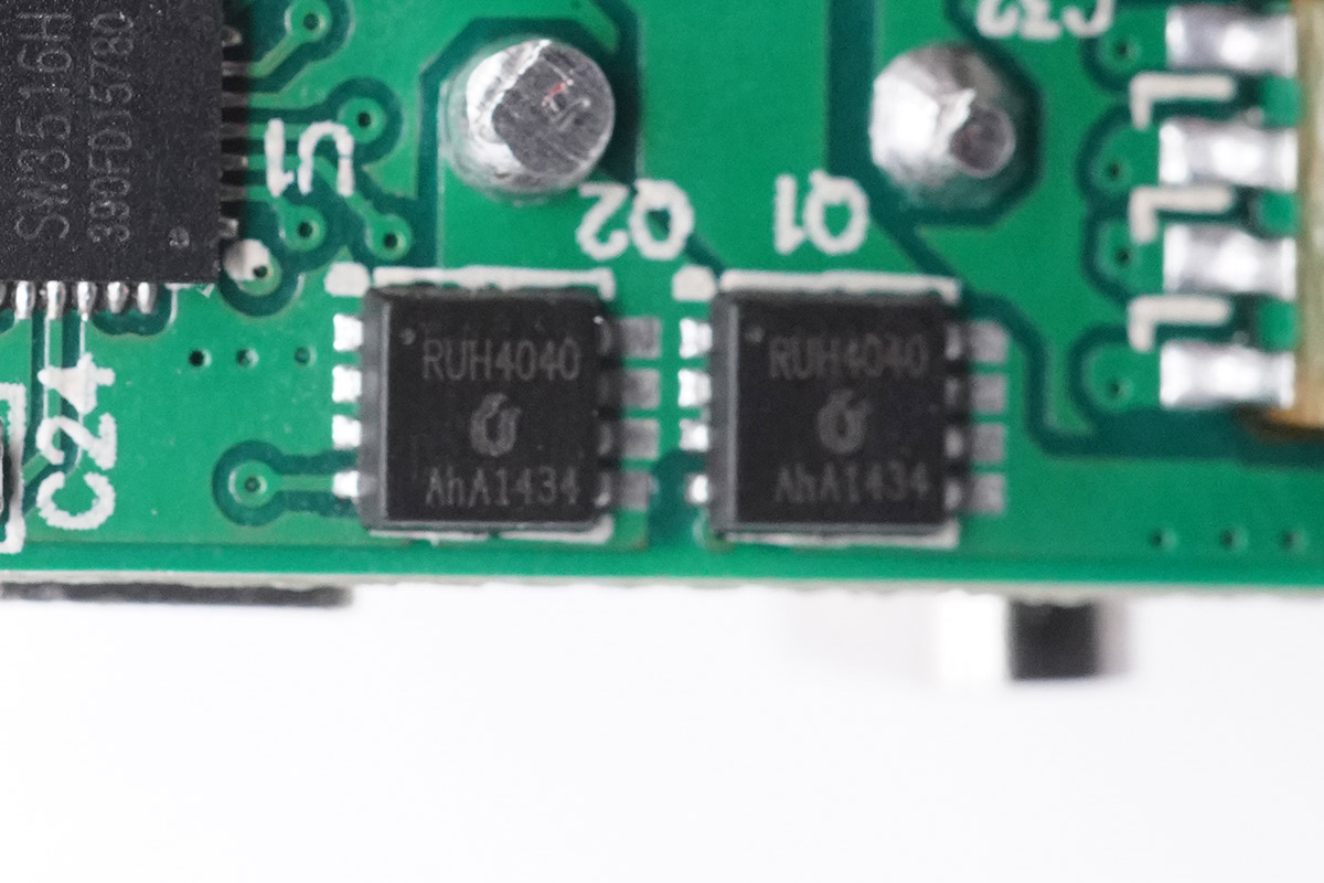 外掛兩顆銳駿RUH4040M2 MOS管為USB-C口輸出同步整流降壓,NMOS,耐壓40V。