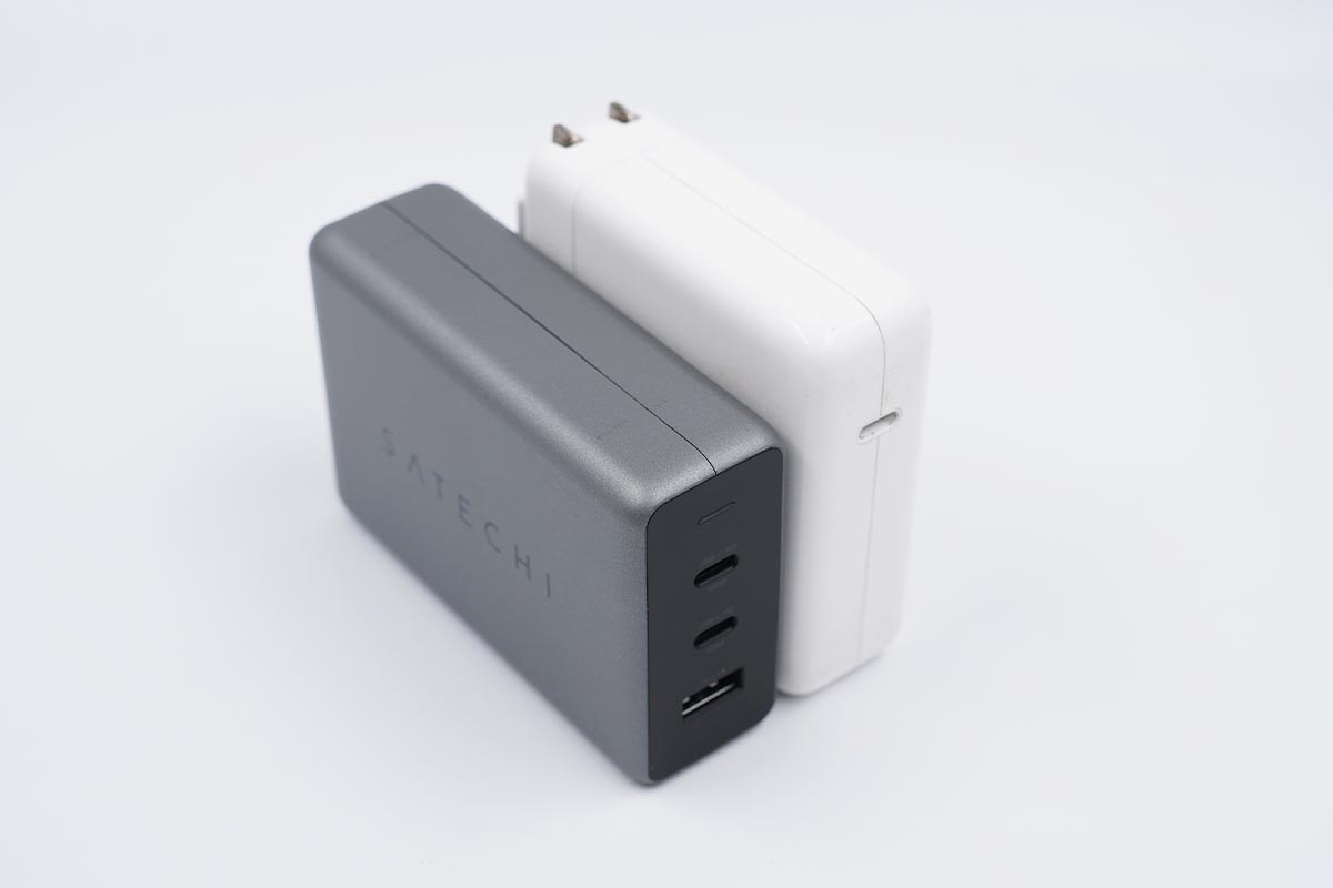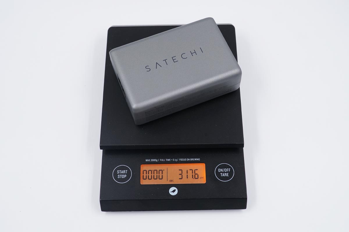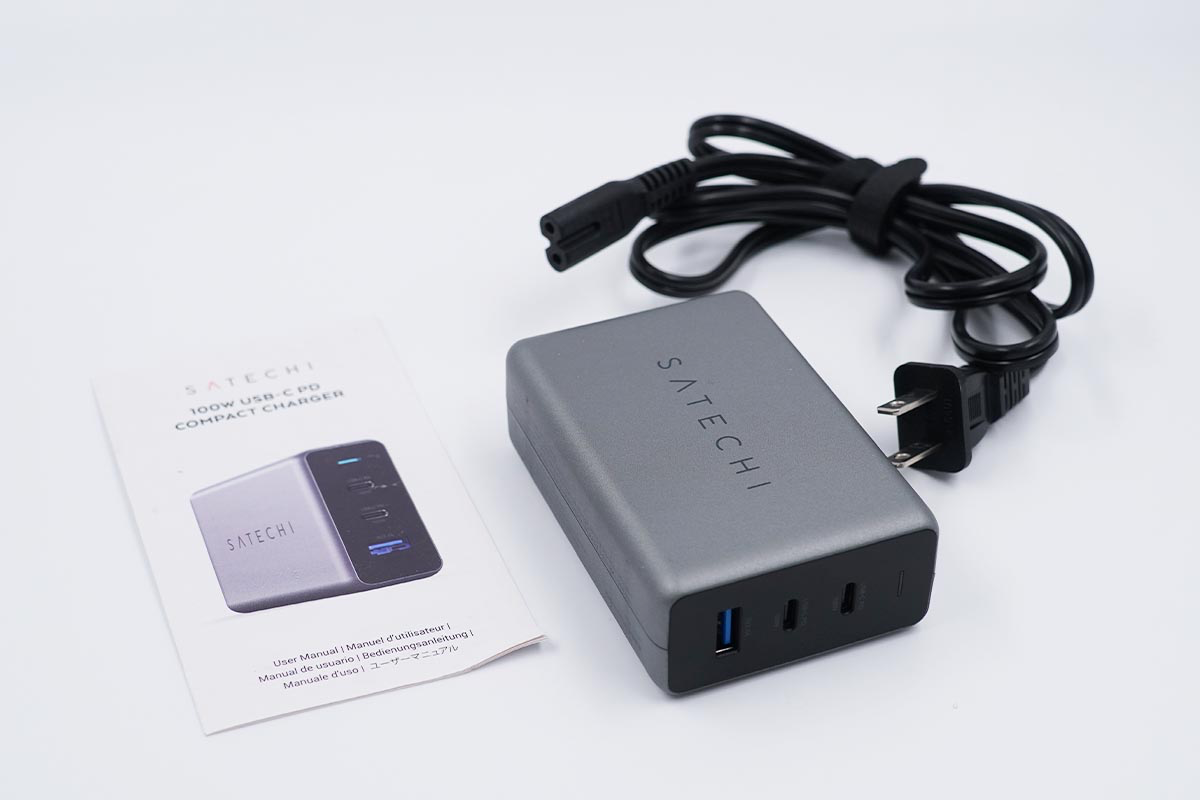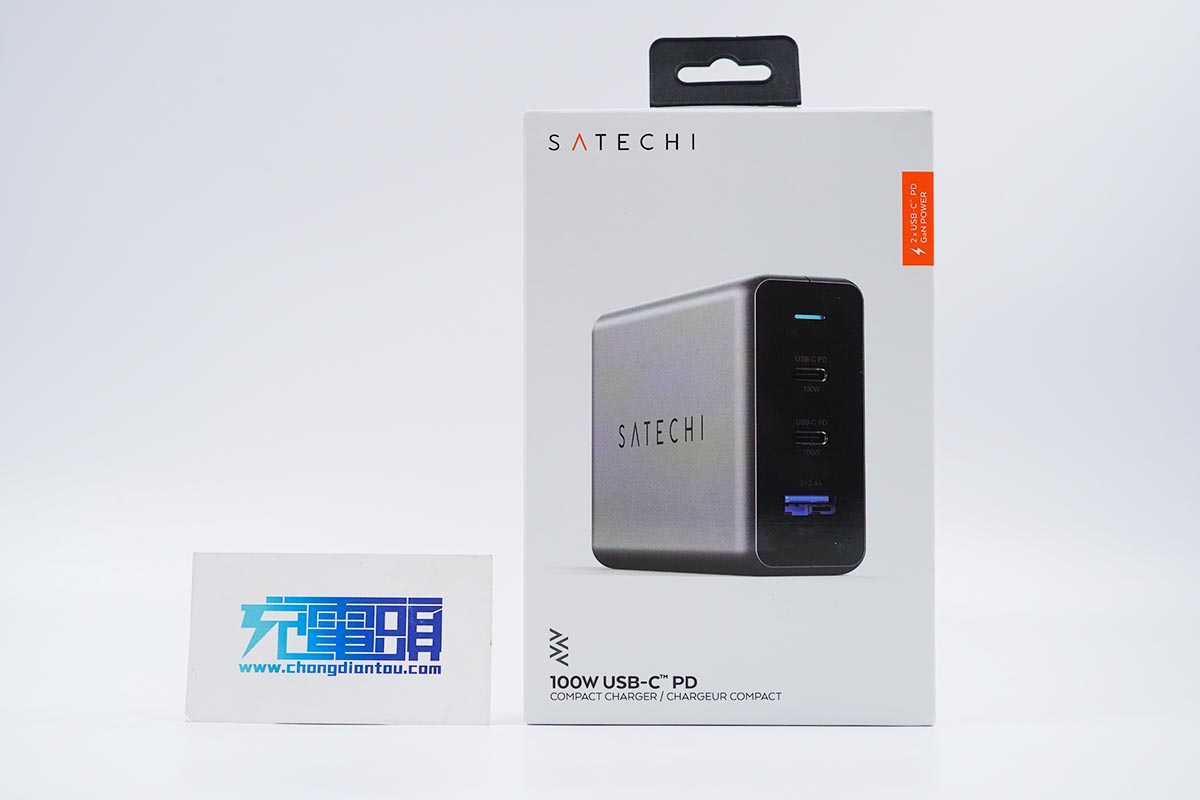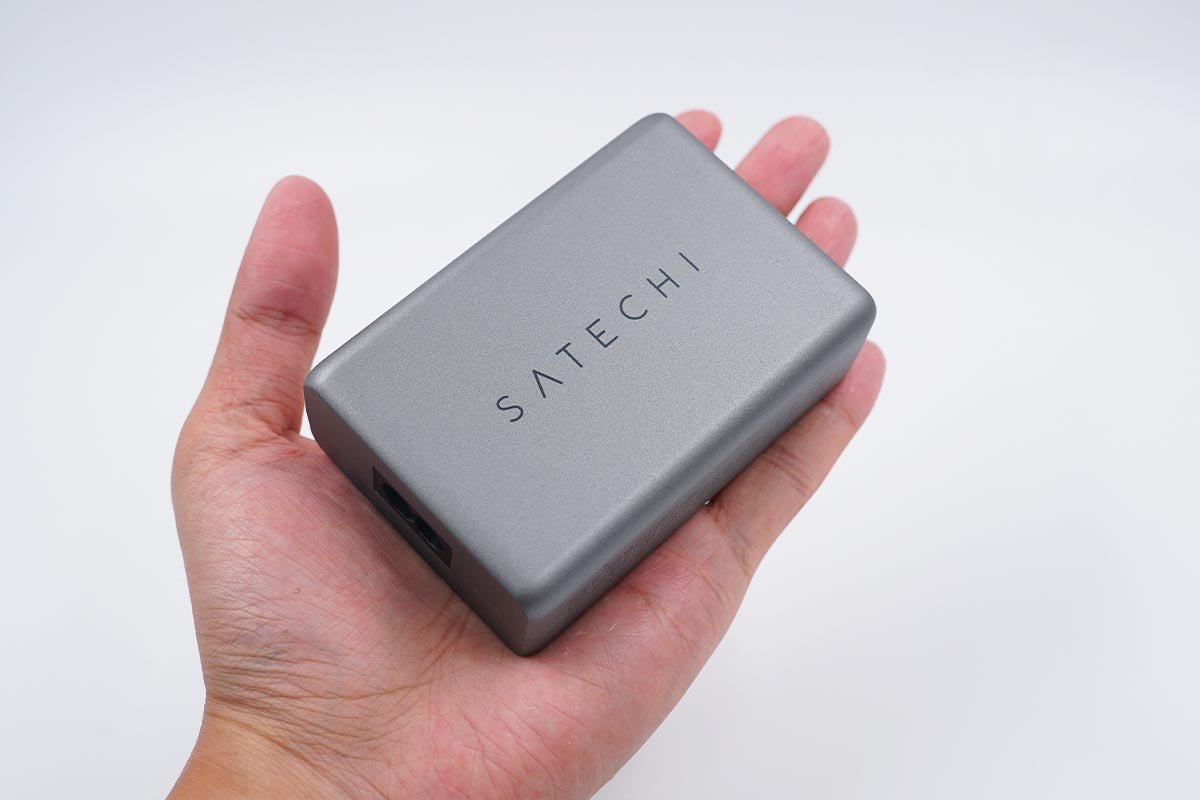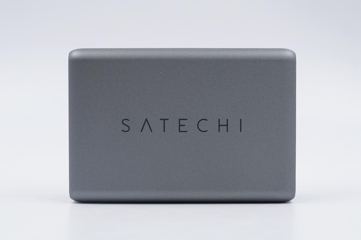 充電器整體造型較為方正,邊角處過渡圓潤,正面印著'SATECHI'的品牌Logo。