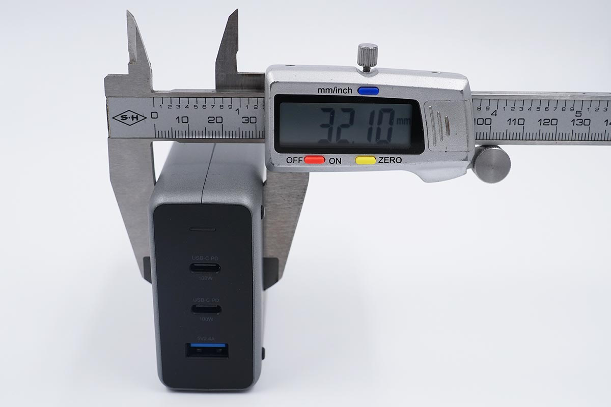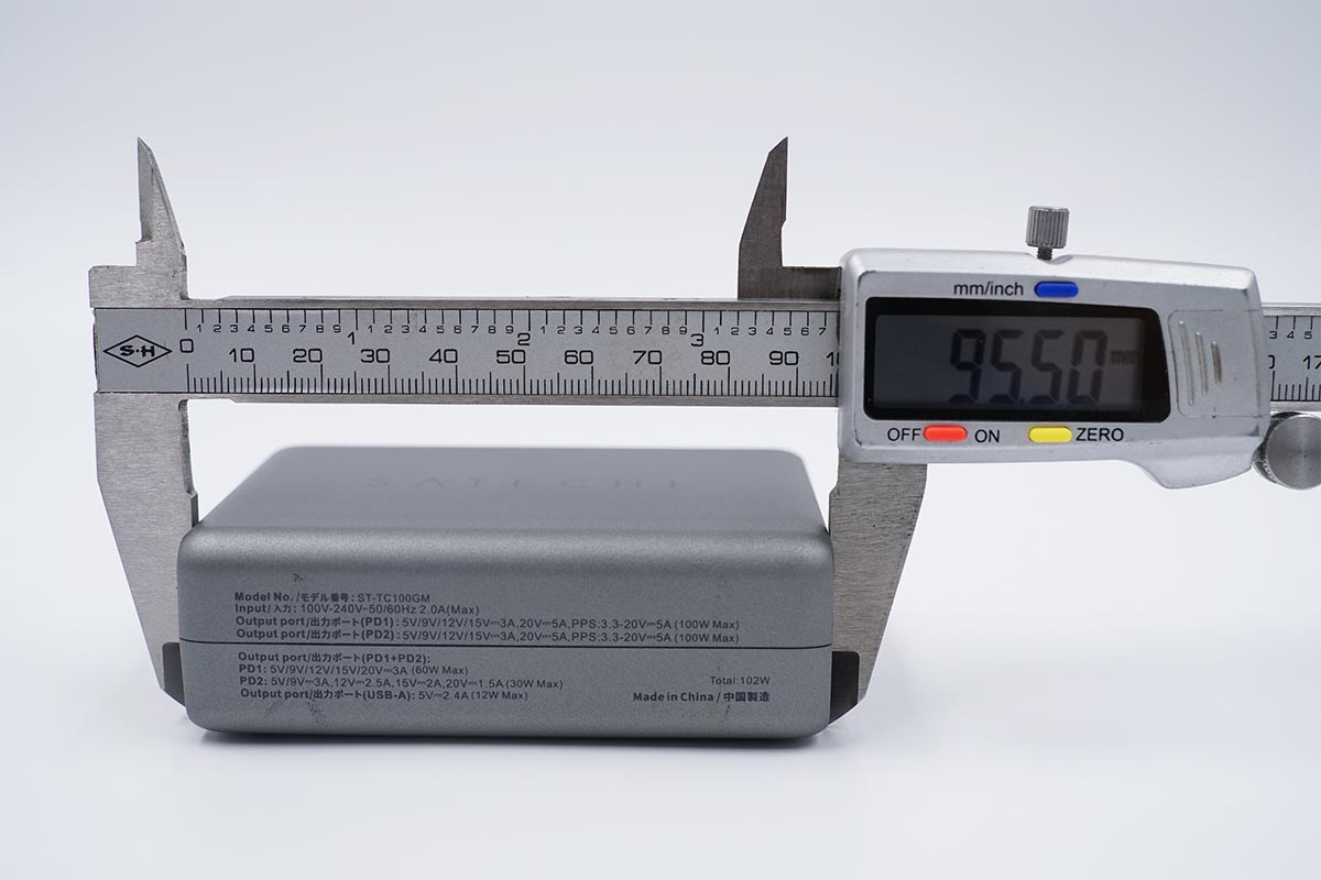 充電器的三維參數為95.5x65.96x32.1mm,由此可以得出充電器的體積約為202.2cm3,進而可以出充電器的功率密度為0.49W/cm3 。