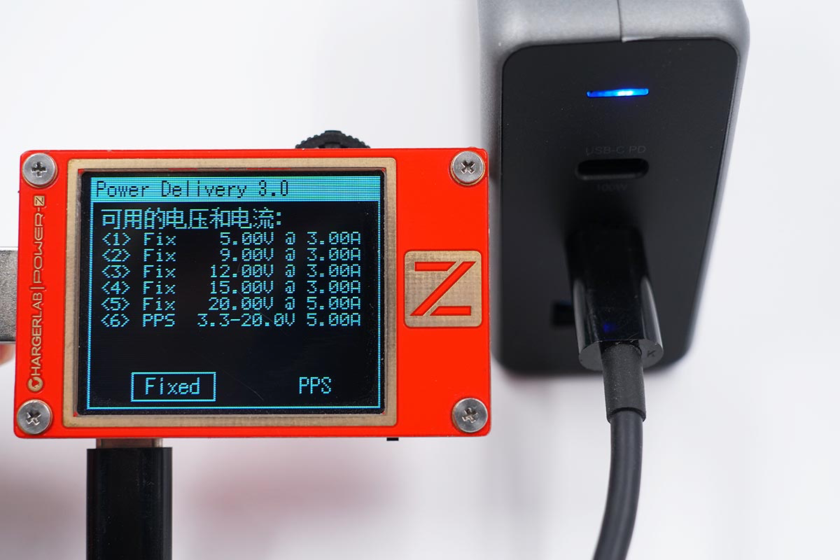 性能方面充電器支持PD、PPS、Apple2.4A等快充協議,支持5V3A、9V3A、12V3A、15V3A、20V5A五個固定電壓檔位和3.3-20V 5A一組PPS檔位。
