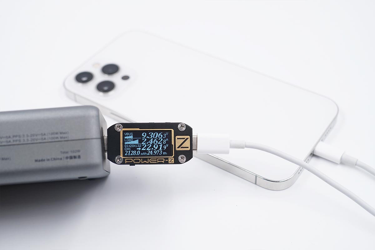 iPhone 12 Pro Max支持Apple2.4A/USB PD快充協議,使用USB-C1為iPhone 12 Pro Max充電,功率為9.30V 2.46A 22.91W。