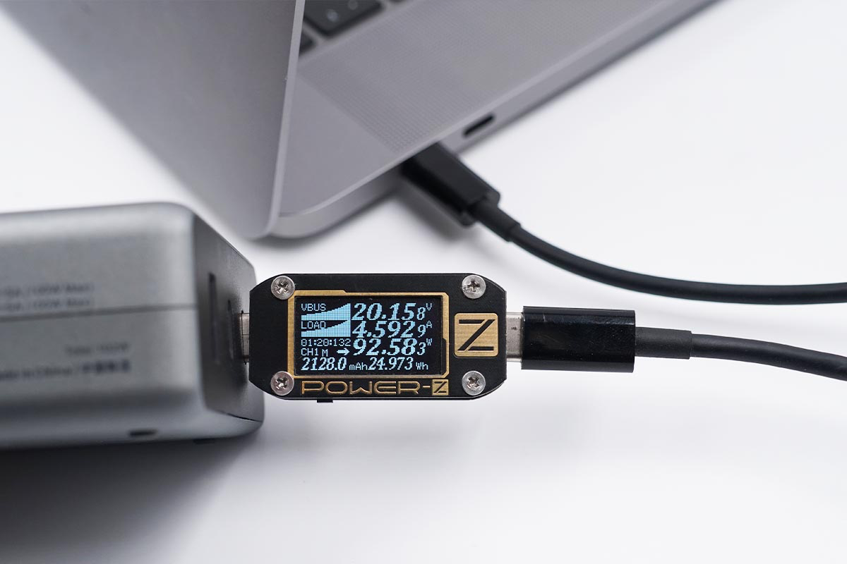 MacBook Pro 16僅支持USB PD快充協議,使用USB-C1為MacBook Pro 16充電,功率為20.15V 4.59A 92.58W。