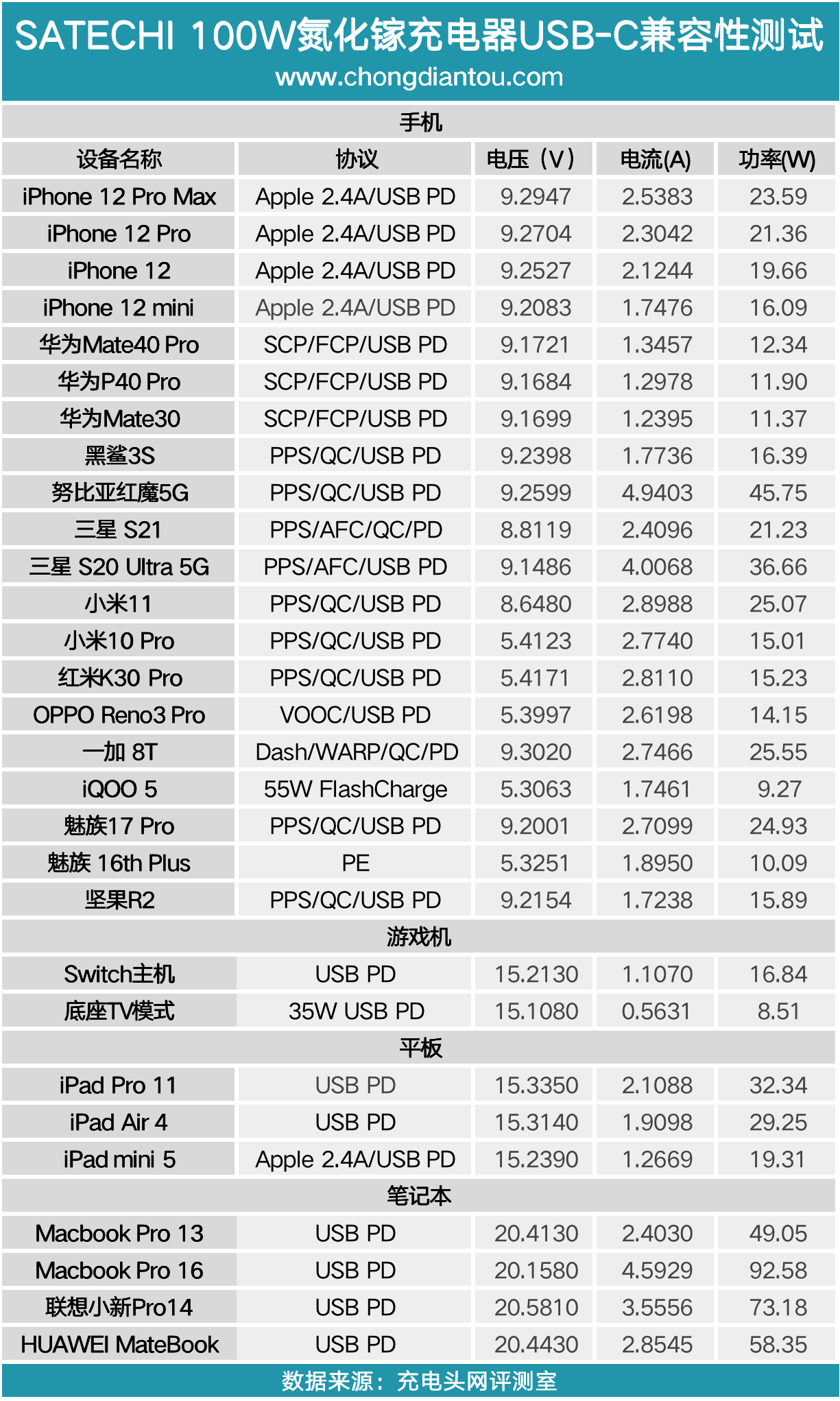 從快充協議的支持上和100W的PD快充功率就可以看出這款充電器主要面向的設備是筆記本電腦,其次是一些支持PD和PPS快充的設備,對于一些支持PPS快充的手機的充電表現均非常不錯。