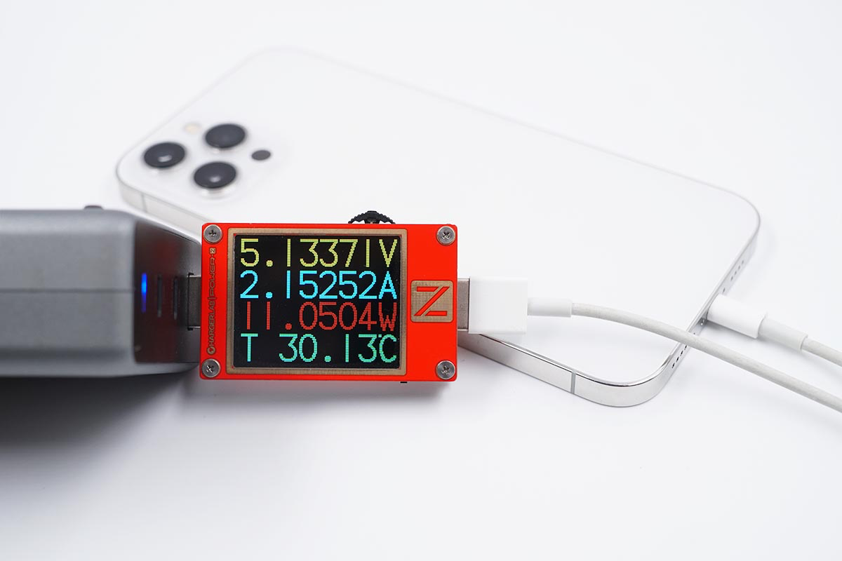 iPhone 12 Pro Max支持Apple2.4A/USB PD快充協議,使用USB-A為iPhone 12 Pro Max充電,功率為5.13V 2.15A 11.05W。