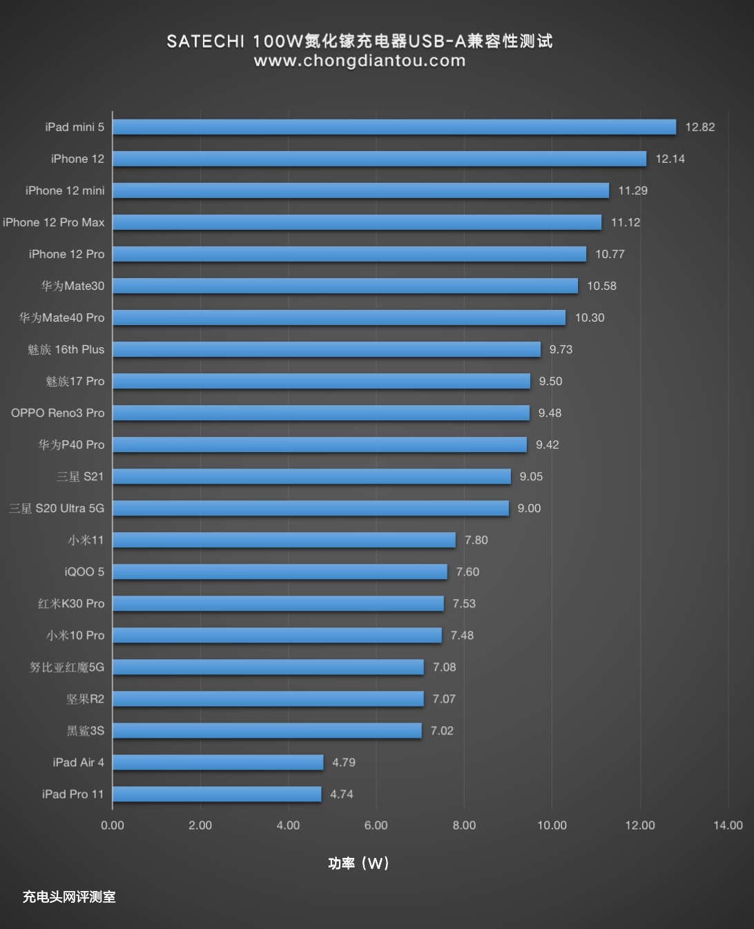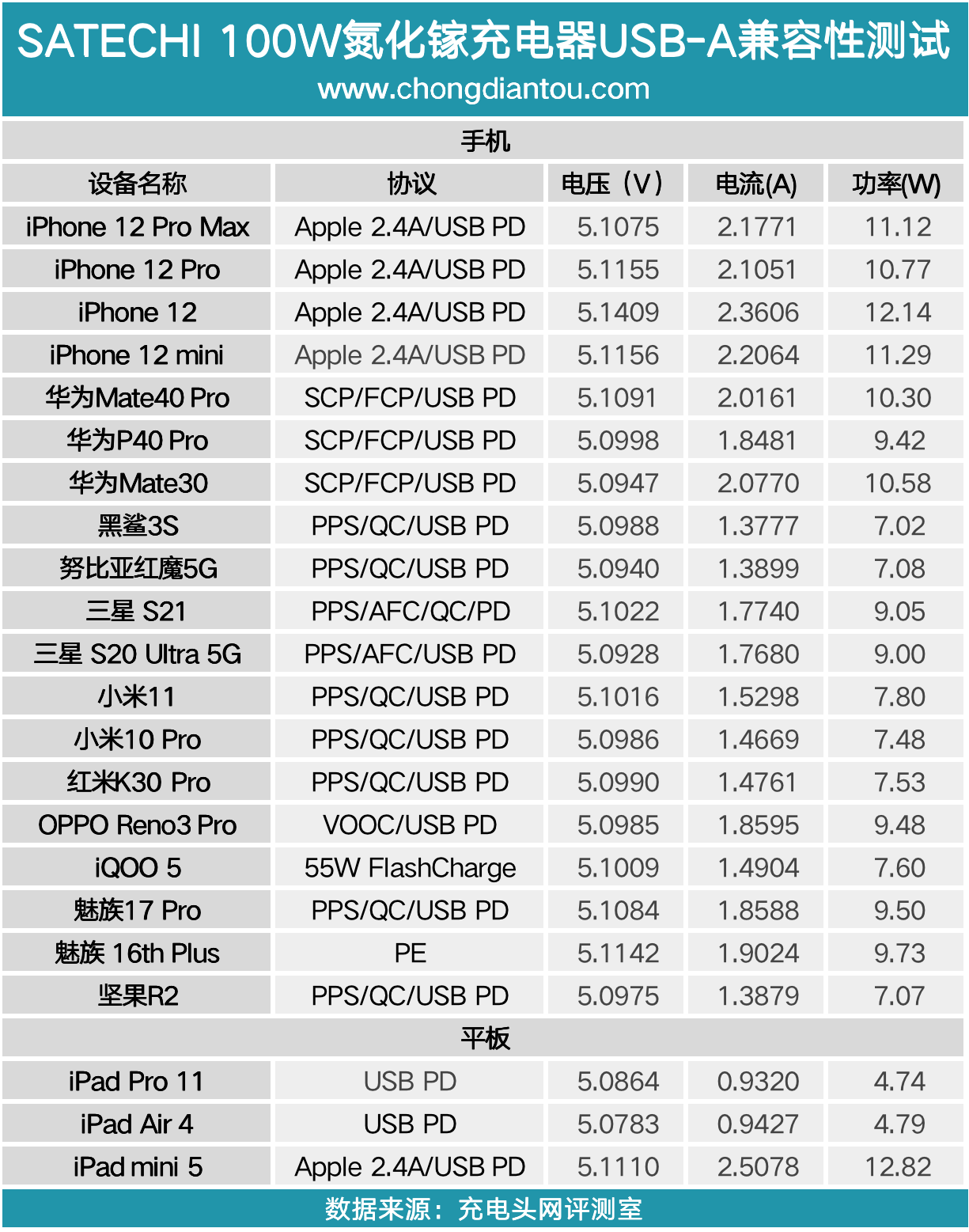 由于USB-A僅支持Apple2.4A快充協議,所以對于Lightning接口的蘋果設備均可以提供Apple2.4A充電,剩余其他的設備功率均在10W左右。