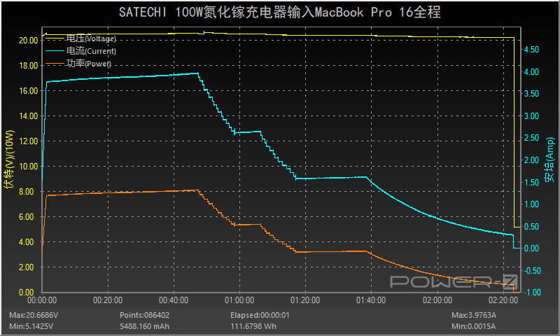 為了模擬真實的使用場景,此次筆者還加入了充電器為設備充電全程的測試,測試環境為使用充電器為待機狀態下的MacBook Pro 16進行充電。在經歷了短暫的關機充電之后筆電開機,功率持續緩慢爬升,46分前功率均穩定在80W左右,隨后功率和電流呈階梯式的下降狀態。1小時38分后,功率和電流逐漸下降直至充電結束,全程耗時約2小時22分,最高功率為20.51V 3.95A 81.13W。