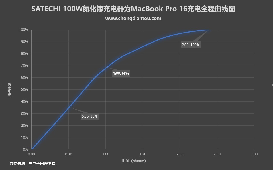 從曲線圖上看,充電器半小時為MacBook Pro 16充電35%,1小時充電68%,完全充滿需要2小時22分。