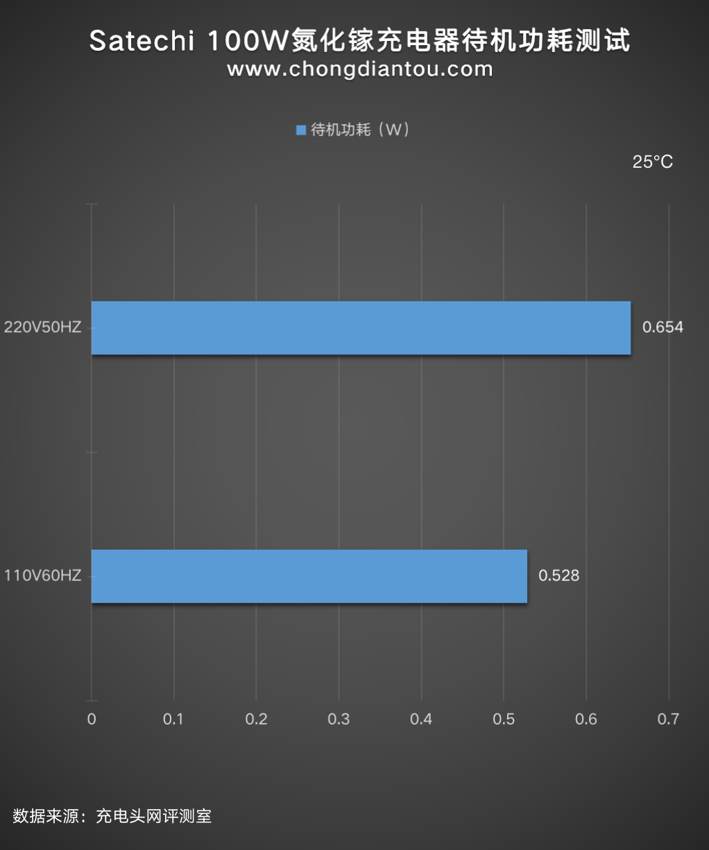 經過功率計測試,Satechi 100W氮化鎵充電器在220V 50Hz的空載功耗為0.654W,換算下來一年損耗的電能約為5.72KW·h,若市價電為0.6元/KW·h,則充電器一年的空載功耗約為3.42元左右。
