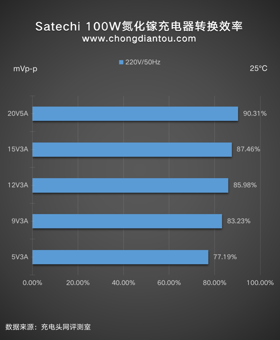 220V 50Hz下,將Satechi 100W氮化鎵充電器在各個電壓檔位的輸出功率拉滿進行測試:五個檔位測得插線板AC端輸入功率和USB端輸出功率,通過計算,可得充電器的轉換效率從77.19%到90.31%不等。