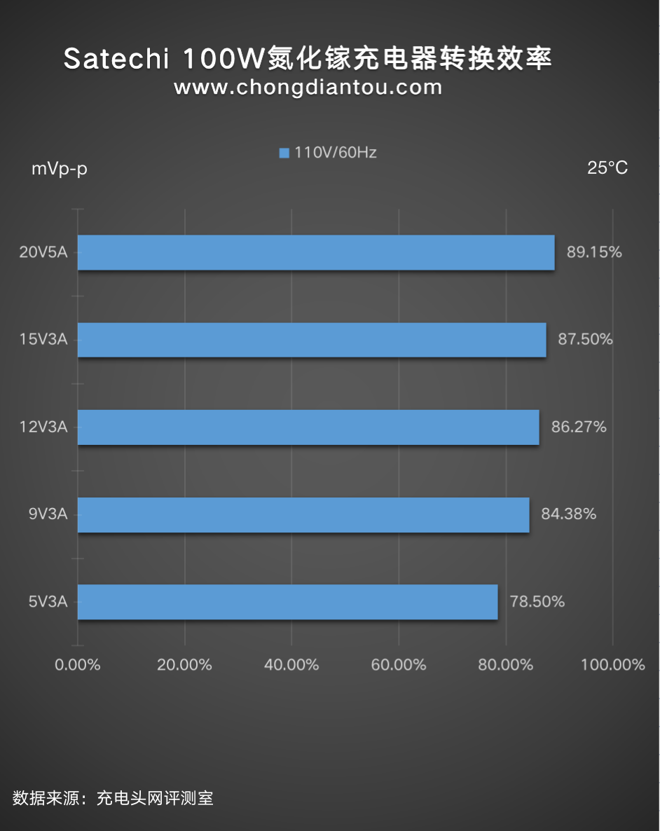 110V 60Hz下,充電器的轉換效率從78.50%到89.15%不等。