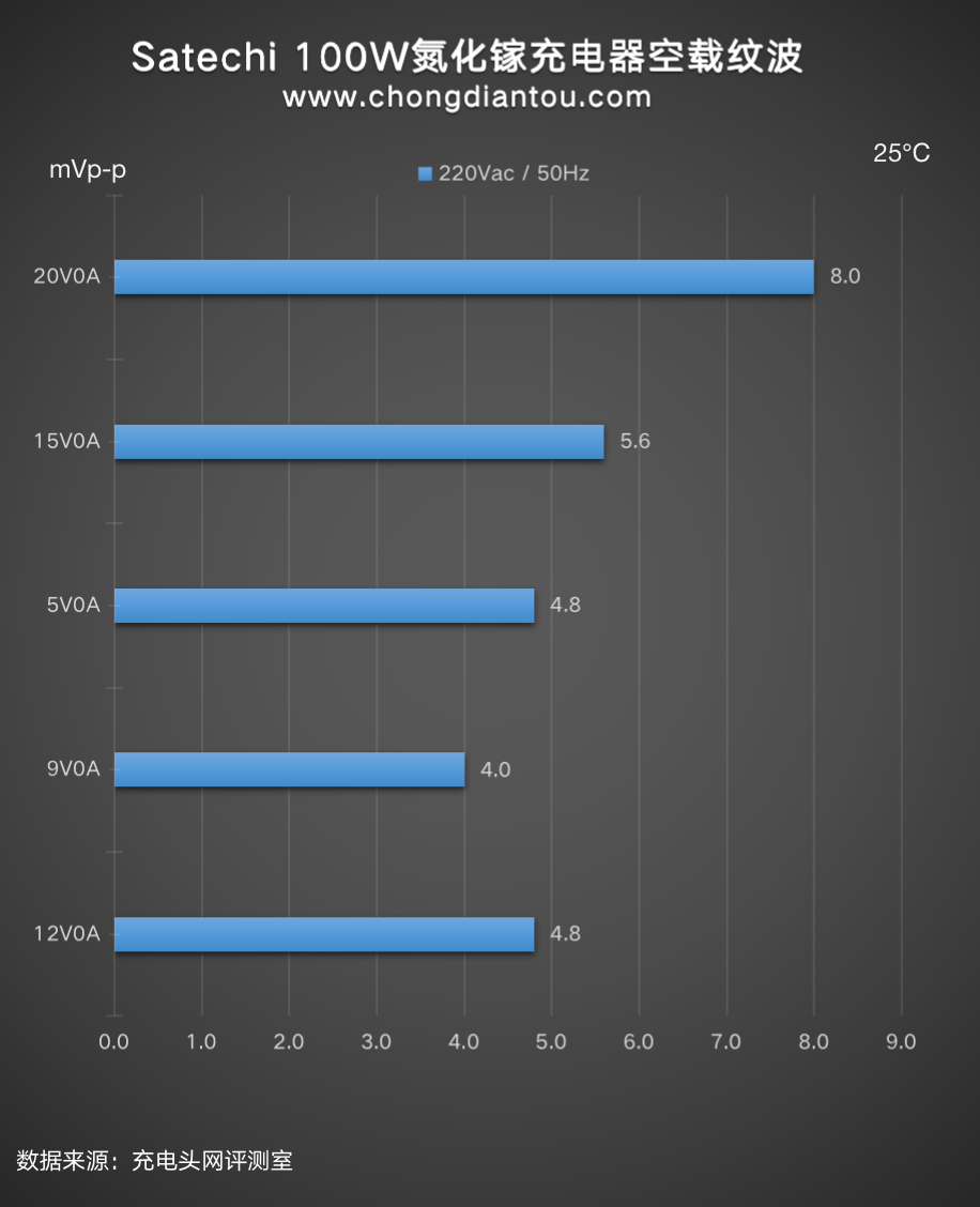空載情況下:五個檔位輸出時紋波峰峰值從4.0mVp-p到8.0mVp-p不等。