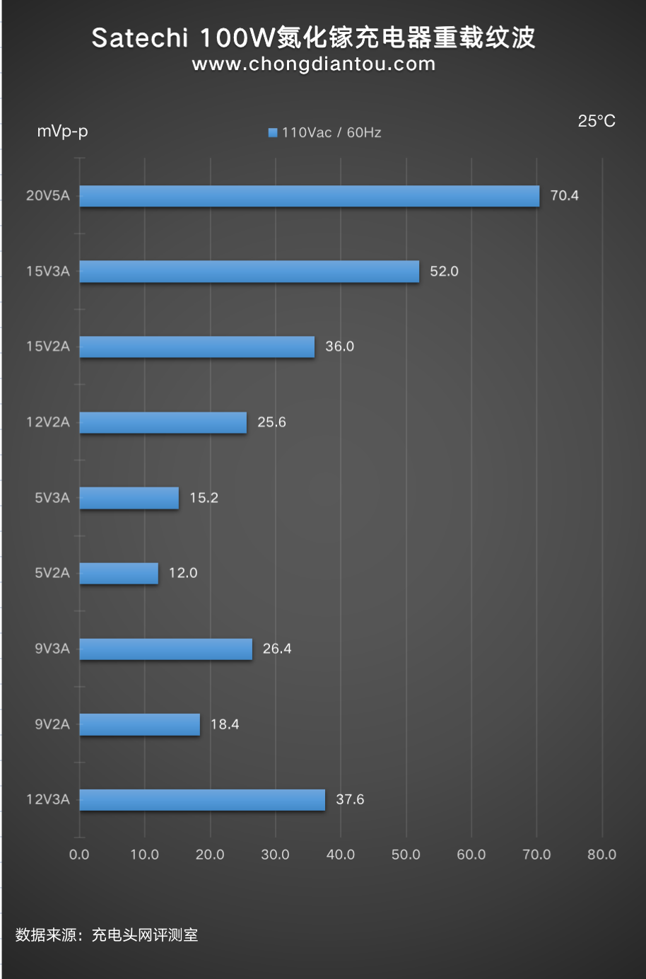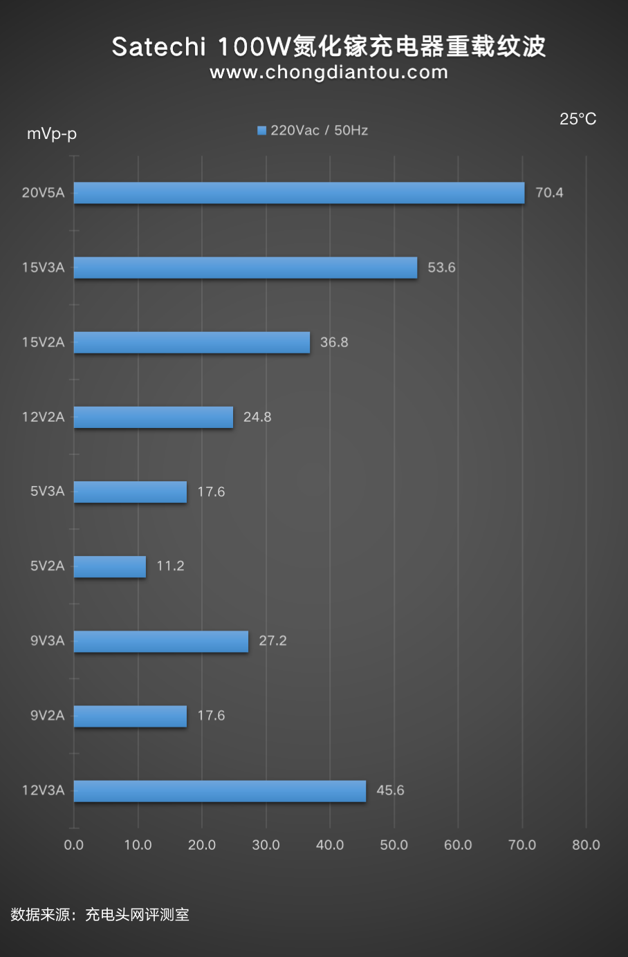 重載情況下:九個檔位輸出時紋波峰峰值從12.0mVp-p到70.4mVp-p不等。